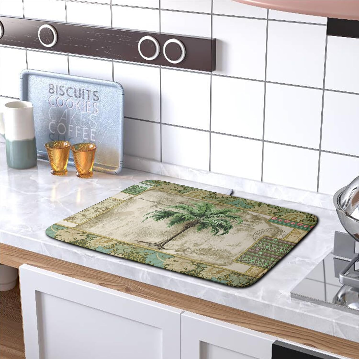 Palm Tree Kitchen Dish Drying Mat for Dishes 18x24 Inch Summer Vintage Tropical Leaves Green Jungle Plant Drying Mat Botanical Dish Drainer Mat Super Absorbent Dish Rack Pad for Coffee Bar Sinks