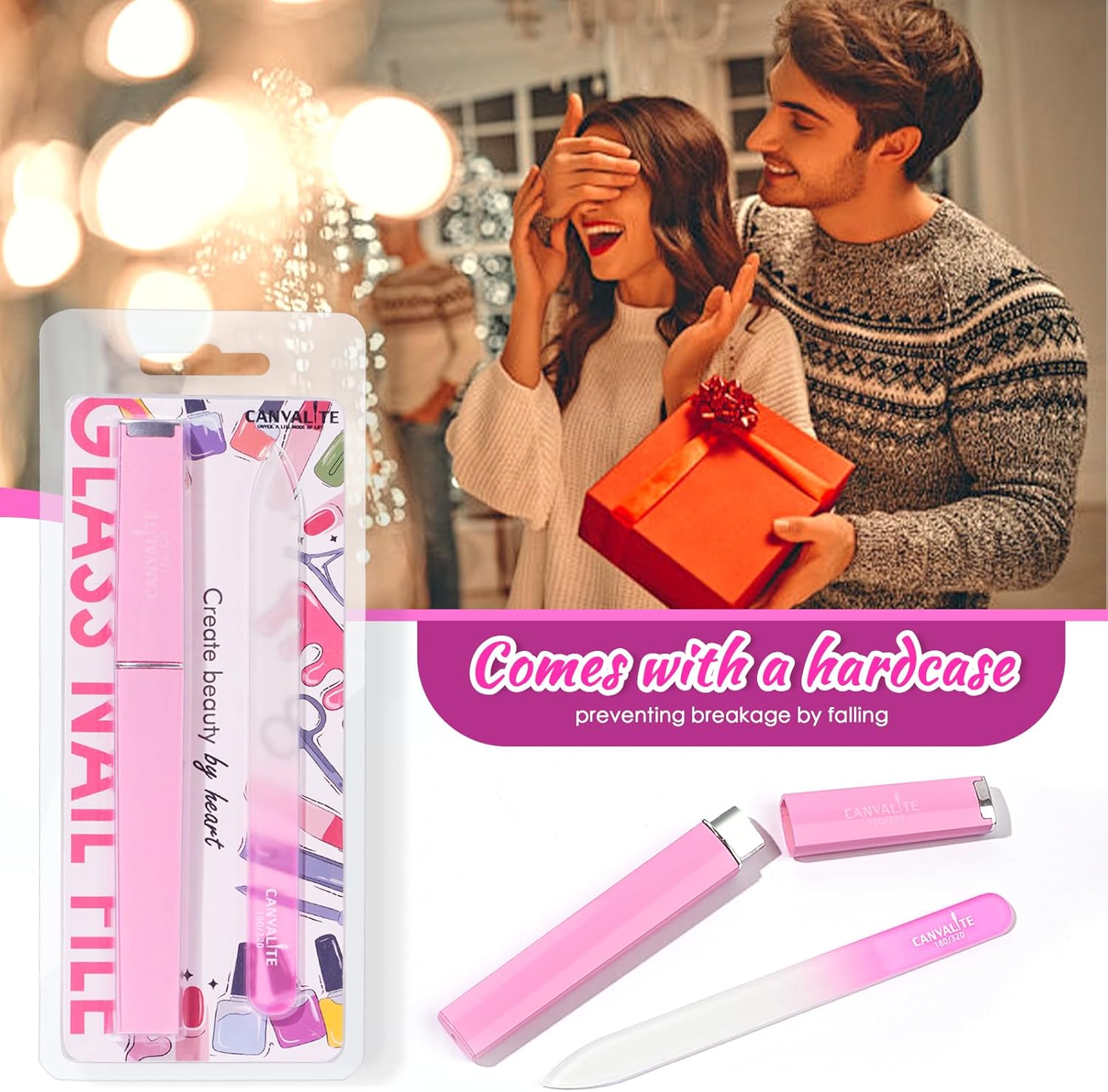 CANVALITE Glass Nail Files for Natural Nails Glass Fingernail File with Case Double Sided 180/320 Grit Stocking Stuffers for Women Girls, Pink