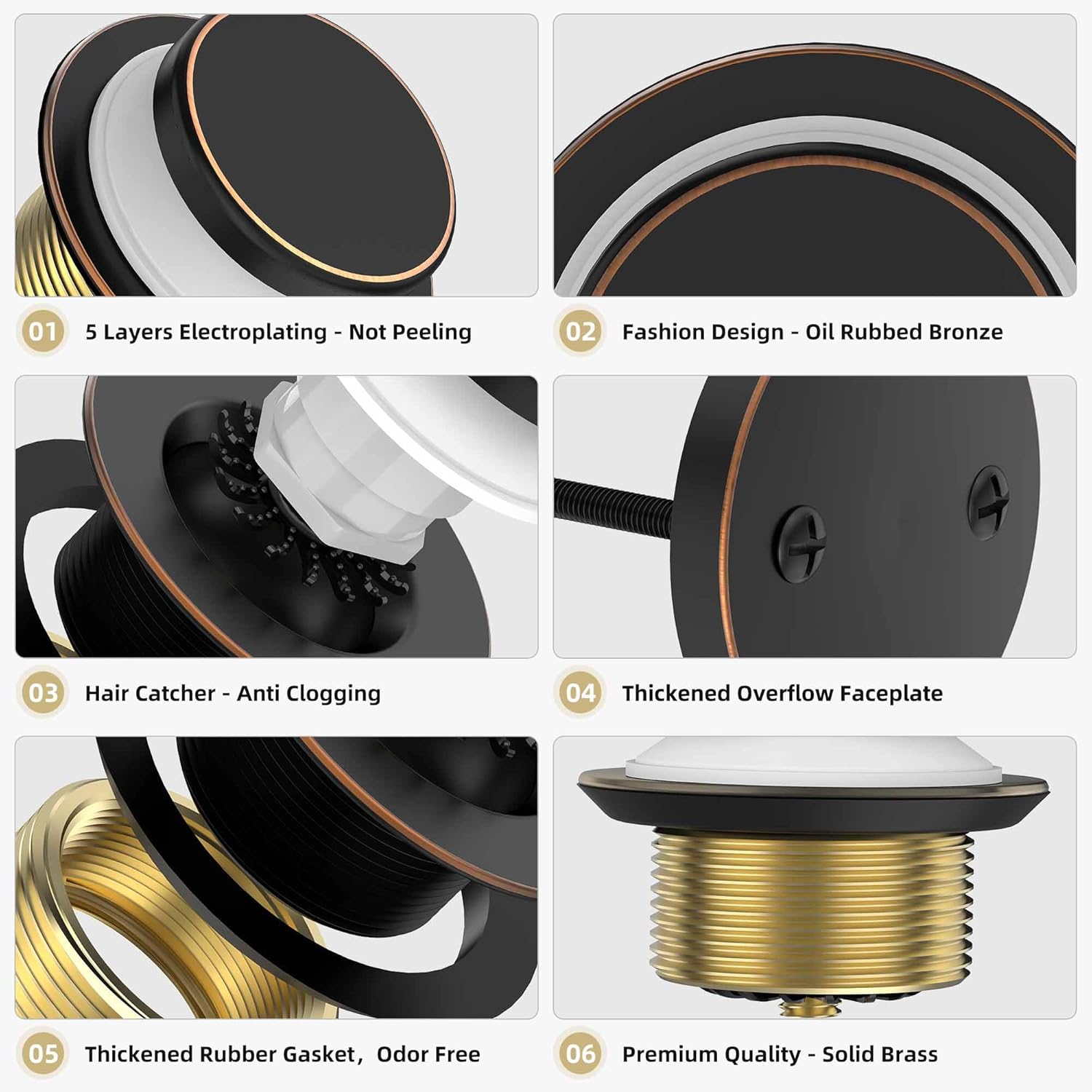 - Hair Catcher, No Leaks: Oil rubbed bronze tub drain includes a hair catcher to gather hair and prevent jewelry loss; thickened rubber gasket minimizes the risk of water leakage; thickened overflow faceplate adds durability