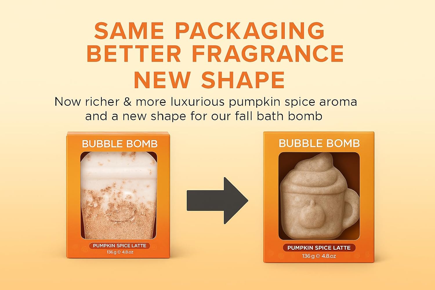 - [New Design] We are transitioning to a new style for our Pumpkin Spice Bath Bomb. Features our new cozy latte mug shape with a pumpkin detail.