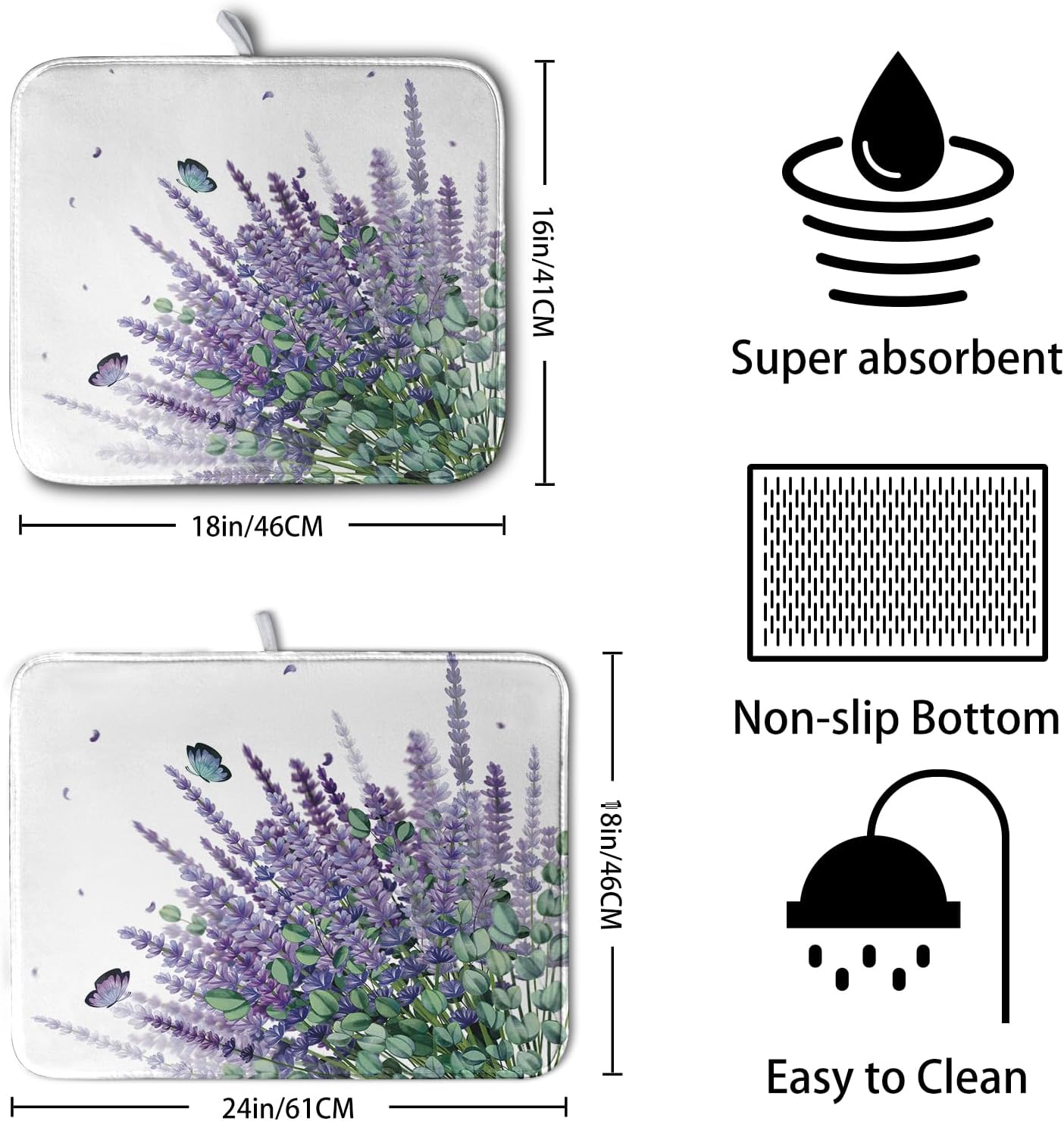 Purple Lavender Dish Drying Mat for Kitchen Counter, 18 x 24 Purple Floral Microfiber Dish Drainer Mats, Absorbent Reversible Microfiber Dish Mat, Butterflies Flowers Kitchen Drying Mats for Dishes