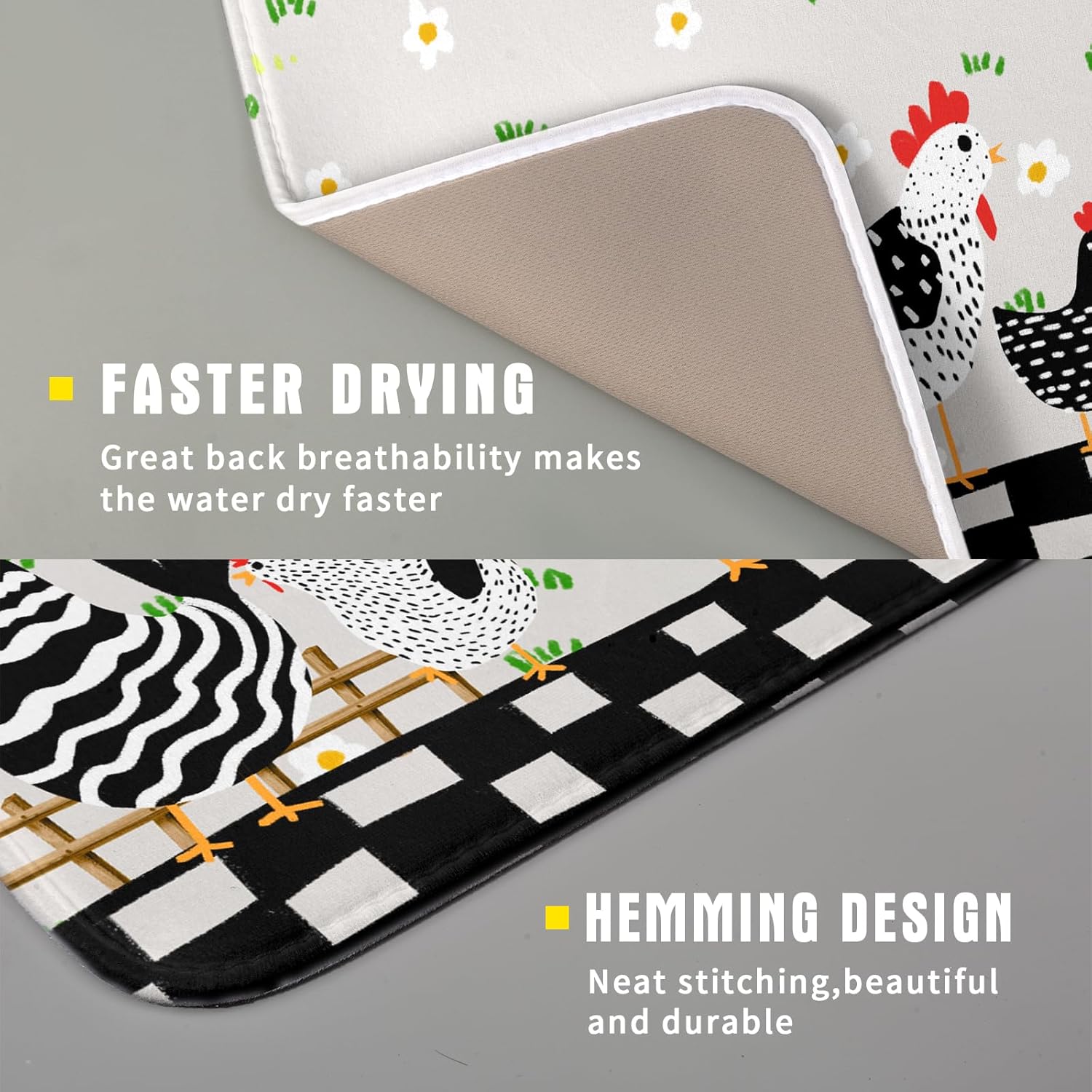 Black Rooster Dish Drying Mat for Countertop 16x18 Inches Buffalo Plaid Microfiber Drainer Rack Pads Fast Dry Dishes Mats Kitchen Accessories
