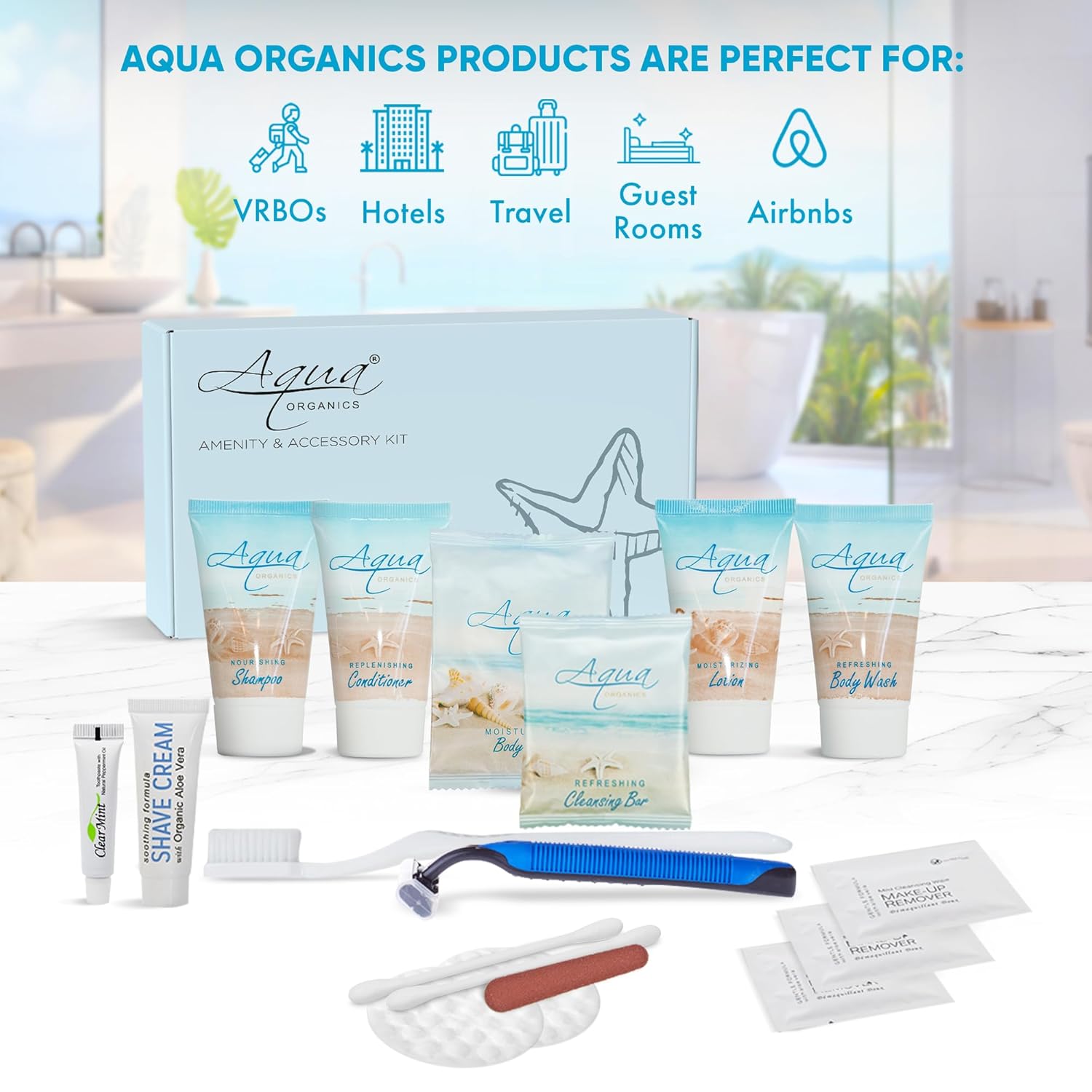 Aqua Organics Amenity & Accessory Kit|1oz Travel Size Shampoo,Conditioner,Lotion,Body Wash,Body Bar, Cleansing Bar, Shave & Dental Sets, Make-Up Remover Wipes & Vanity Kit|60 sets