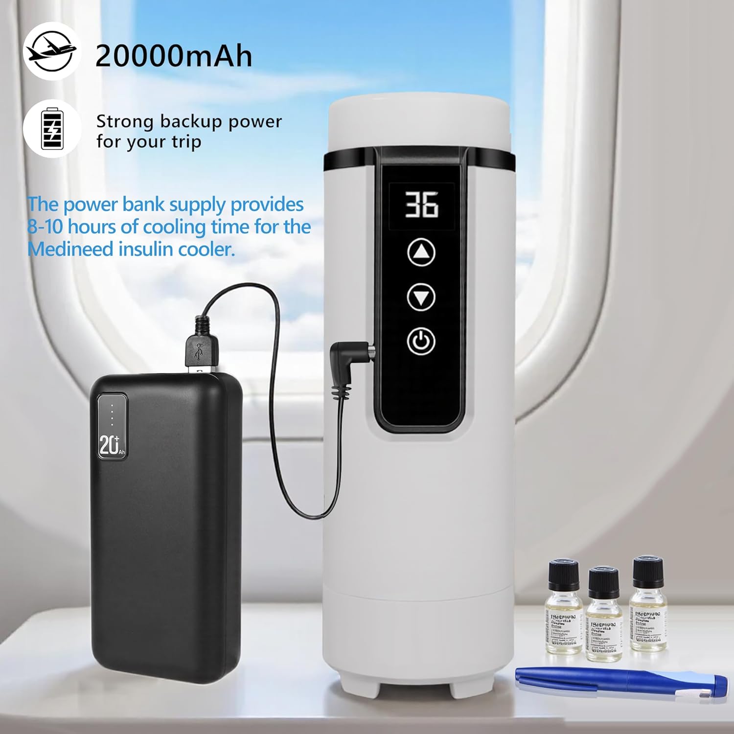 - PORTABLE TRAVEL: The medication cooler for travel is TSA approved, and protective cup cover bag can hold the diabetes care cooler and powerbank, making your traveling more convenient; The matching 20,000mAh portable power bank supply provides 8-10 hours of cooling time for the Medineed insulin cooler
