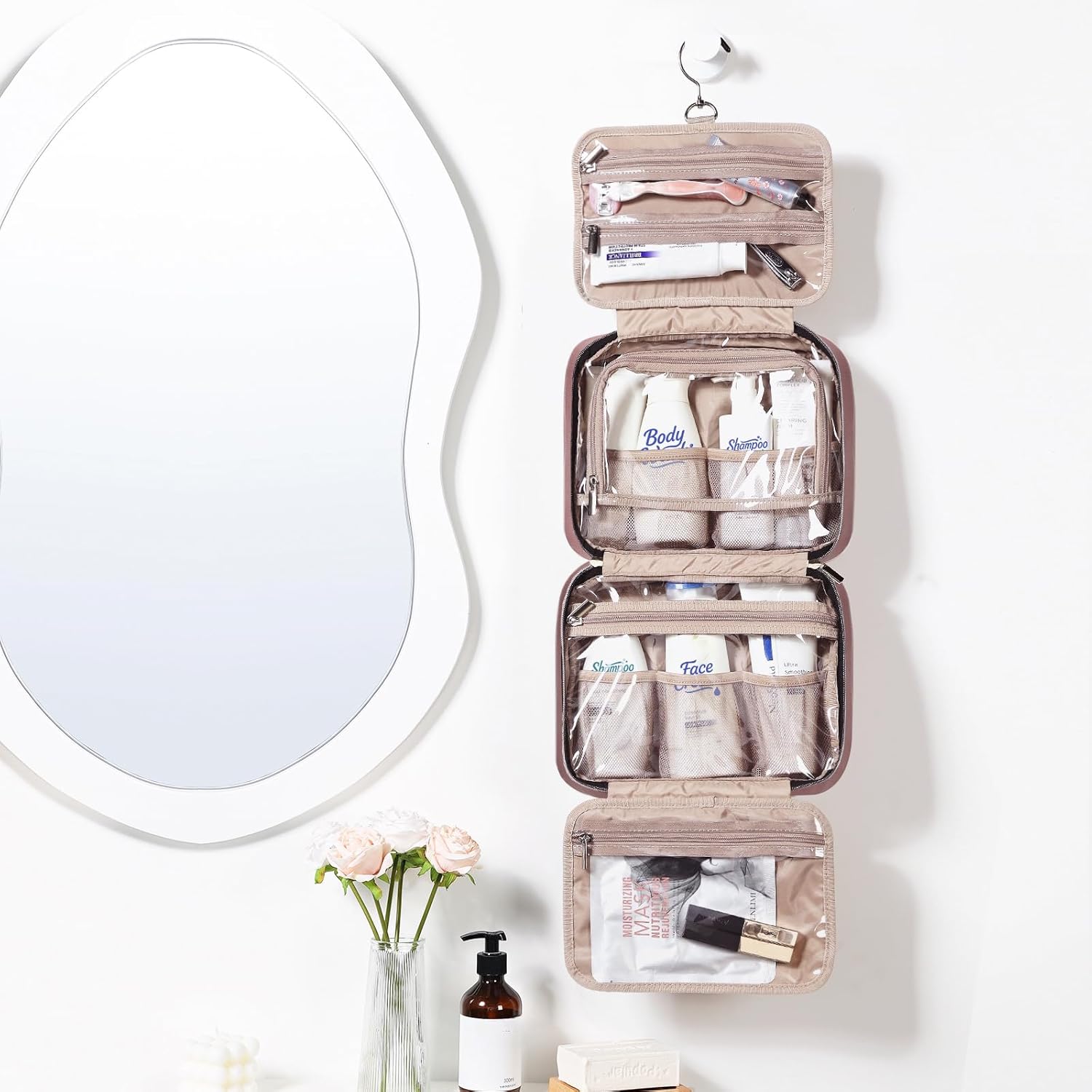 NISHEL Travel Toiletry Bag for women, Portable Hanging Organizer for Travel-Sized Shampoo, Conditioner, Brushes Set, Makeup Accessories, Medium Size, Rosewood-Pink