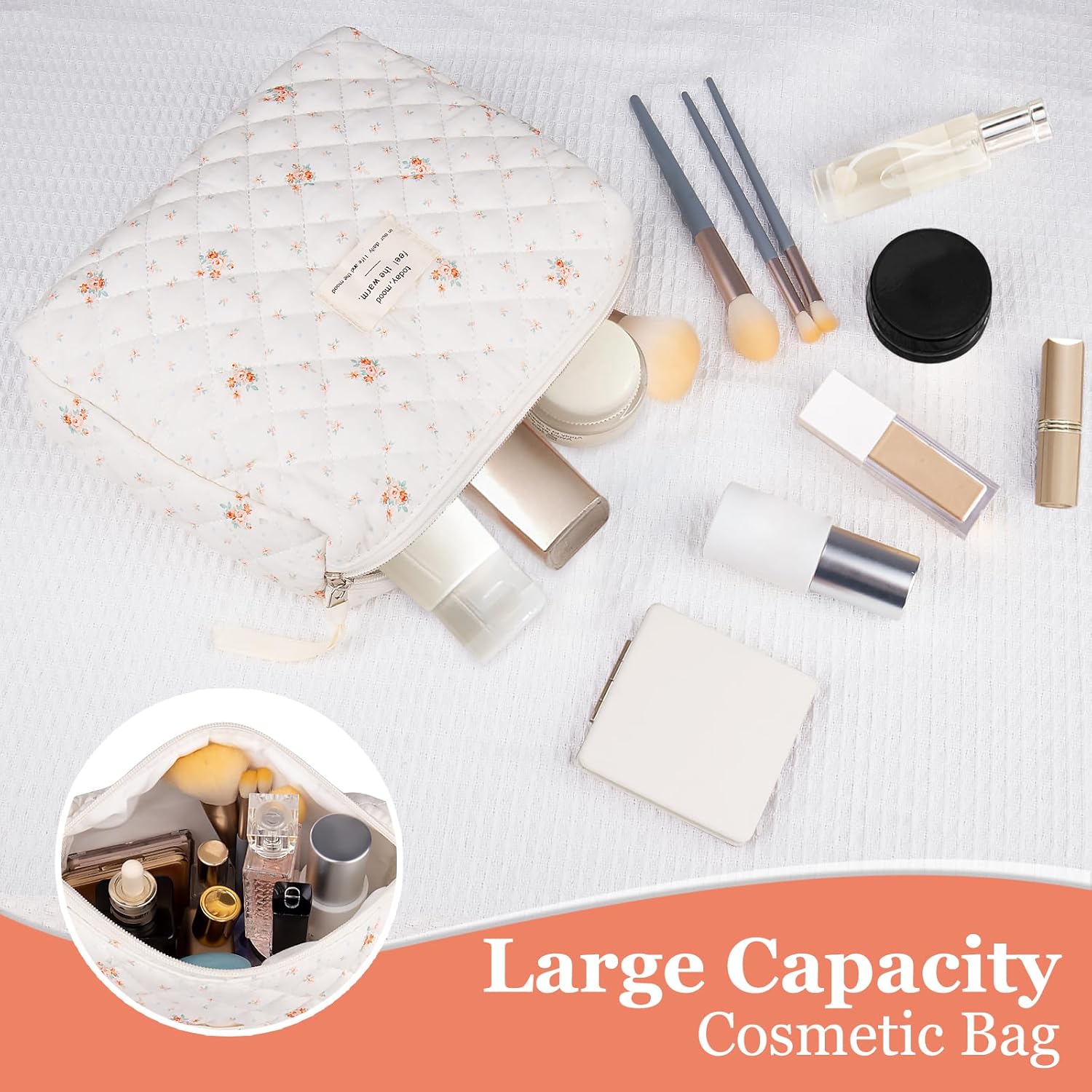 Floral Makeup Bag, Small Cosmetic Bag for Women Girls, Cute Cotton Makeup Bag, Quilted Makeup Bags, Flower Travel Toiletry Organizer Bag(Rose Pattern)