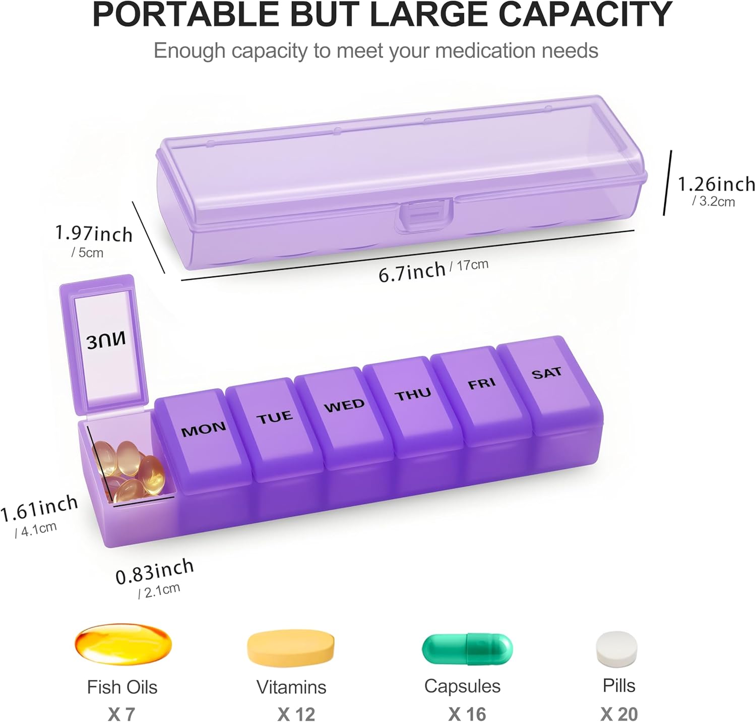 Silicone Weekly Pill Organizer 7 Day, Arthritis-Friendly Medicine Box Daily Pill Box, Large Medicine Case with Shell, Compact Travel Pill Container for Pill, Vitamin, & Fish Oil (Purple)