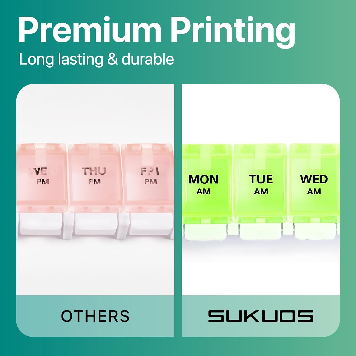 - Long-Lasting Printing: This 7-day AM PM pill organizer features bold marks for the week, making it simple to track your pills without needing to remember. The upgraded printing ensures that these marks remain durable, lasting up to 20,000 uses without showing any wear and tear.