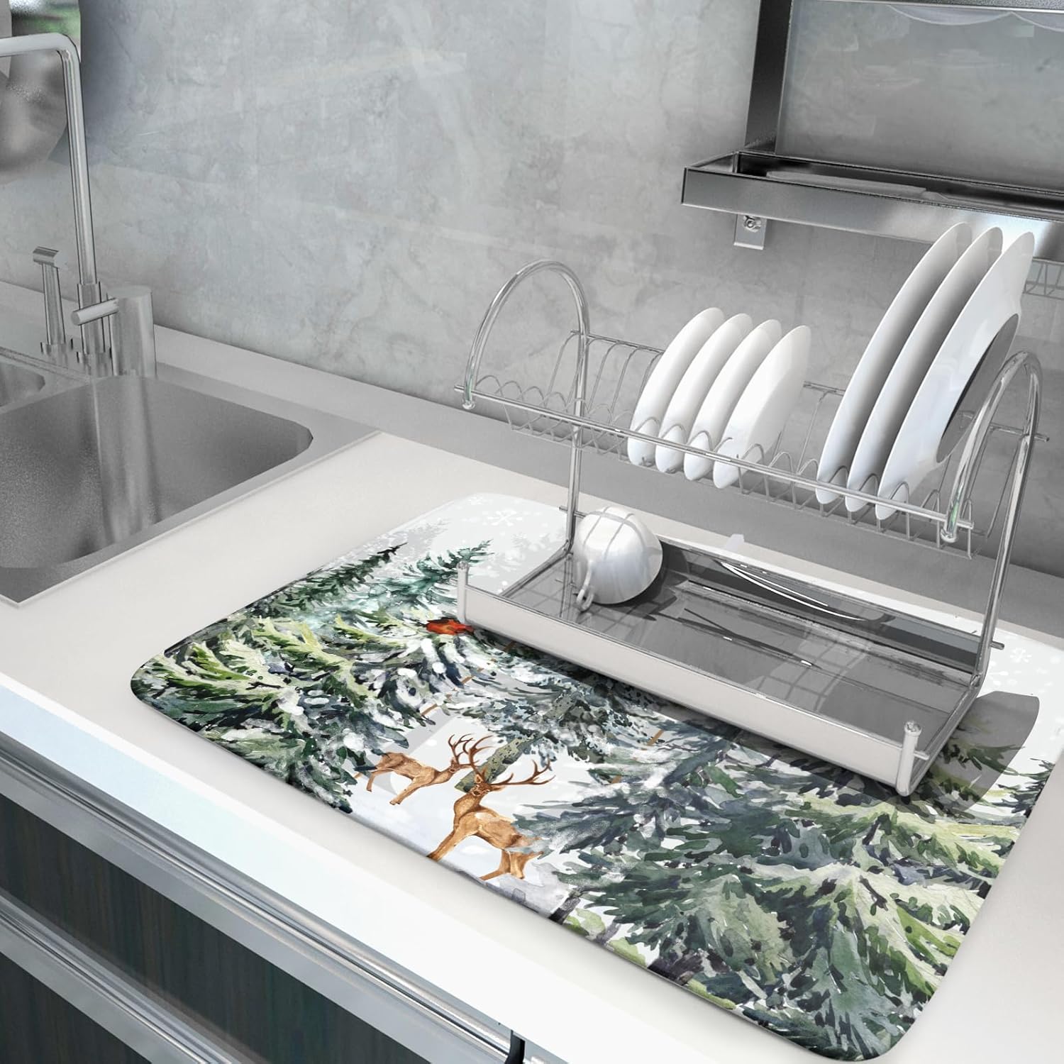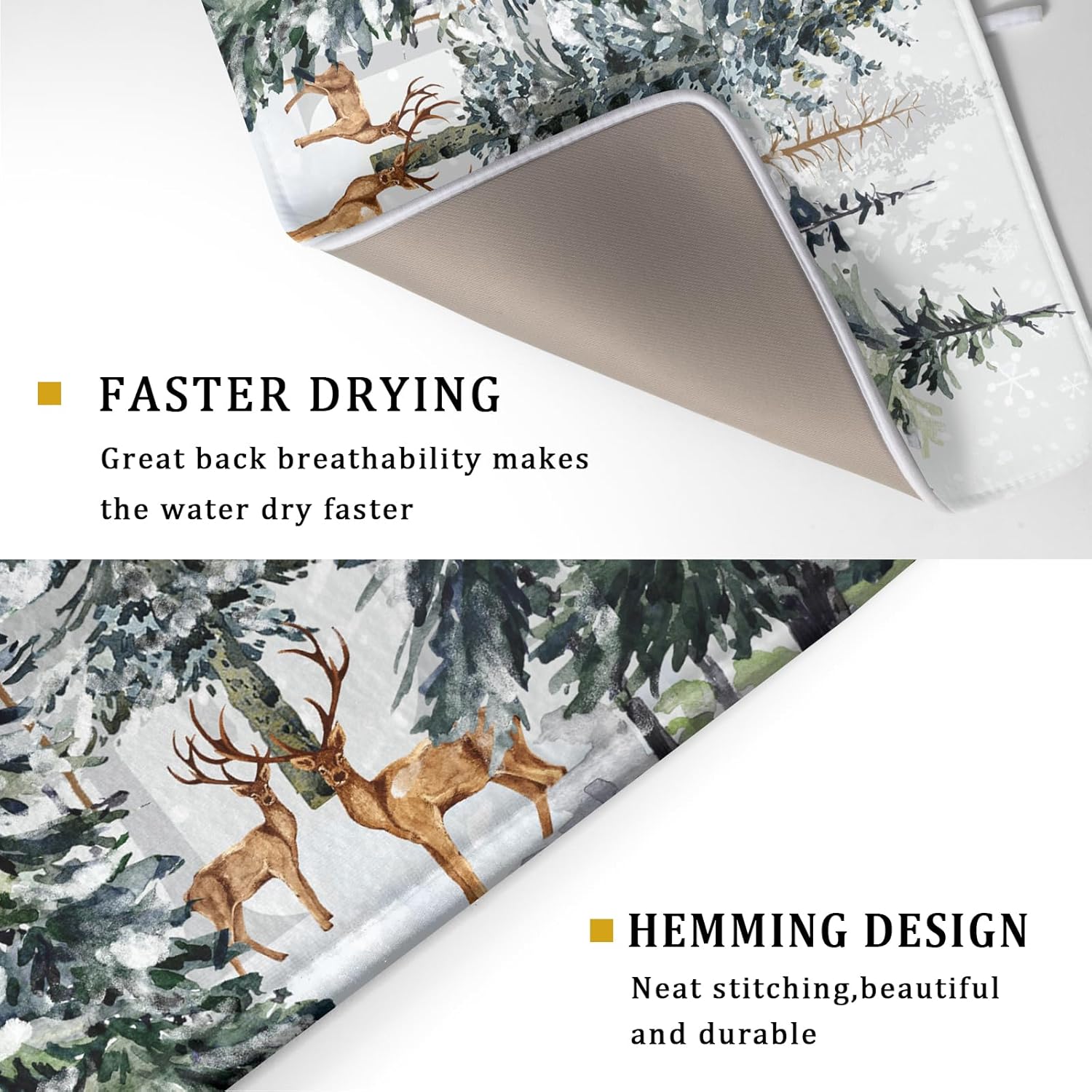 - 【Protect Tableware】Place your dishes on it or under dish racks, the winter forest dish mat prevents bowls, glassware, and more tablewares from being scratched or worn, can be used as dish drying mat, sink mat, dishes drainer mats to keep the countertop dry and tidy.