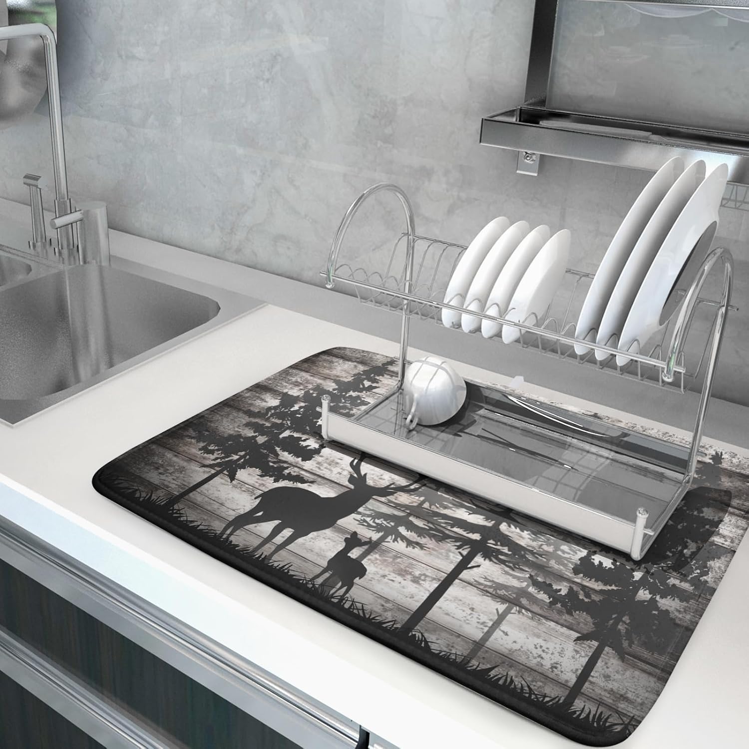 Forest Deer Dish Drying Mat Wildlife Animal Decorative Microfiber Dishes Pad 18x24 Inch Absorbent Reversible Kitchen Counter Drainer Mats