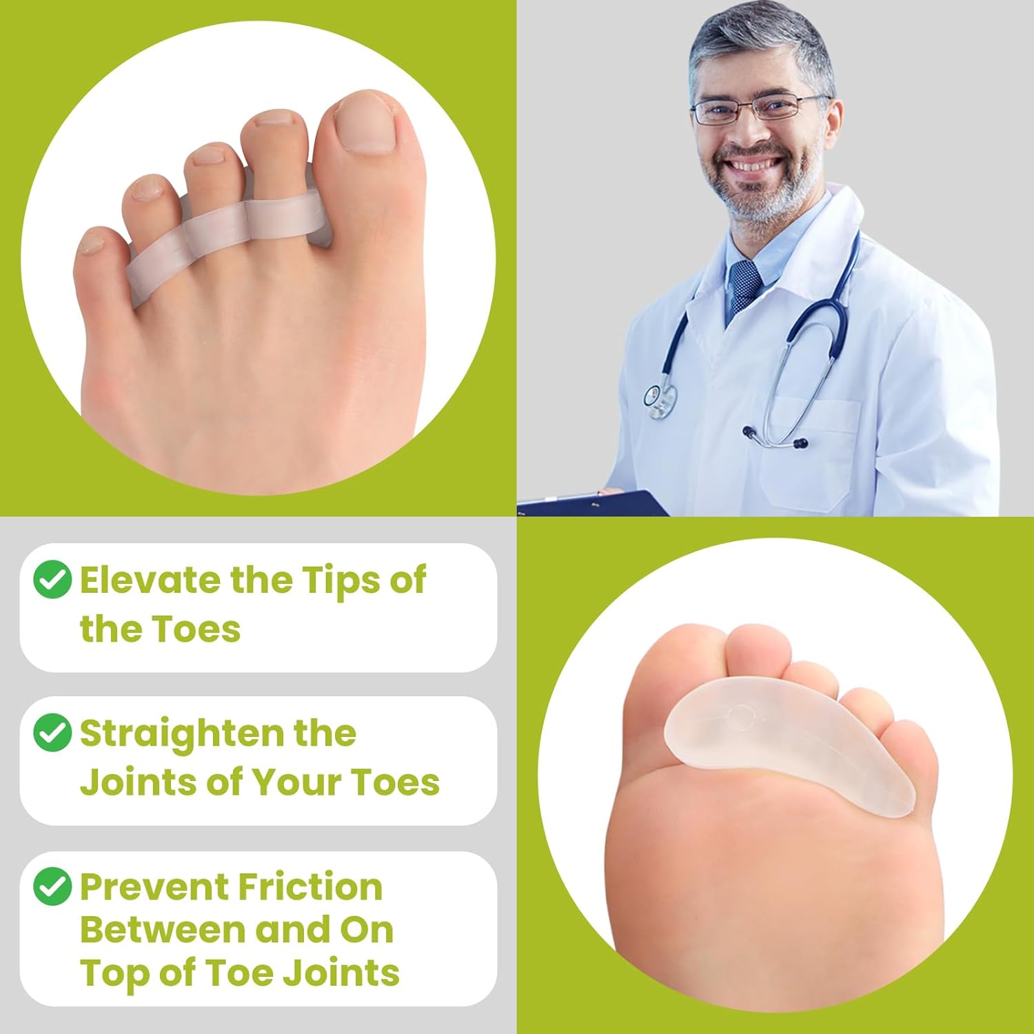 - Physician-Designed Durability - Our toe corrector are made of soft and flexible silicone gel to ensure long-lasting comfort, and our gel can be easily cleaned and reused as often as you need. Silicone and latex free for sensitive skin.