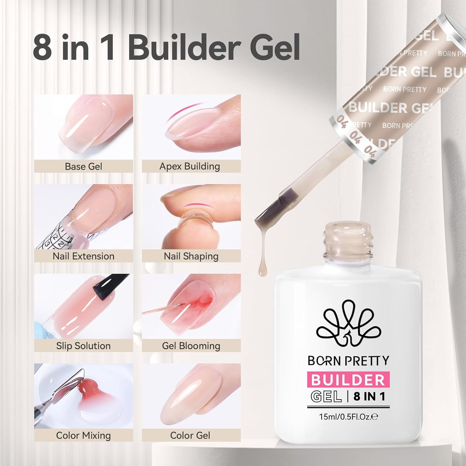 - PACKAGE CONTENTS: BORN PRETTY 15ml Natural Nude builder gel is perfect for nail extensions,apex building, nail enhancement, 3D nail art, DIY glitter gel, infill gaps, nail tips overlay, base gel, cover unevenness, rhinestone gel, can do nail extension, nail repair or reinforcement and nail design at the same time. Suitable for your daily outfit and any occasion.