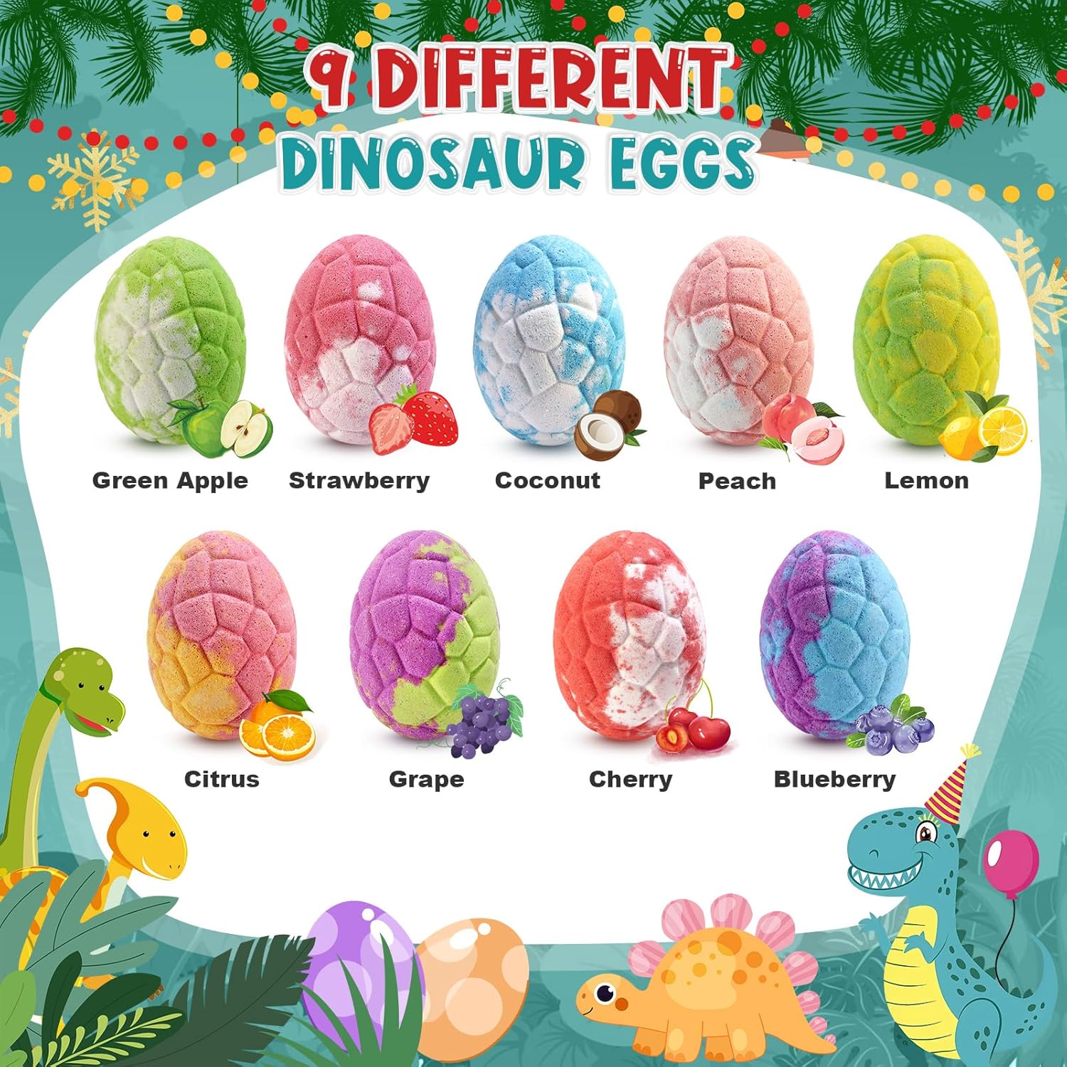 - Dinosaur Bath Bomb Sets for Kids: Our kids bath bomb set contains 9 different dinosaur egg bath bombs, each bomb has a different color and scent (cherry/citrus/lemon/green apple/blueberry/strawberry/grape/peach /coconut). Once the bath bombs are placed in the water, they give the water a vibrant color and release the scent of the essential oils. These bath bombs make bath time fun for kids