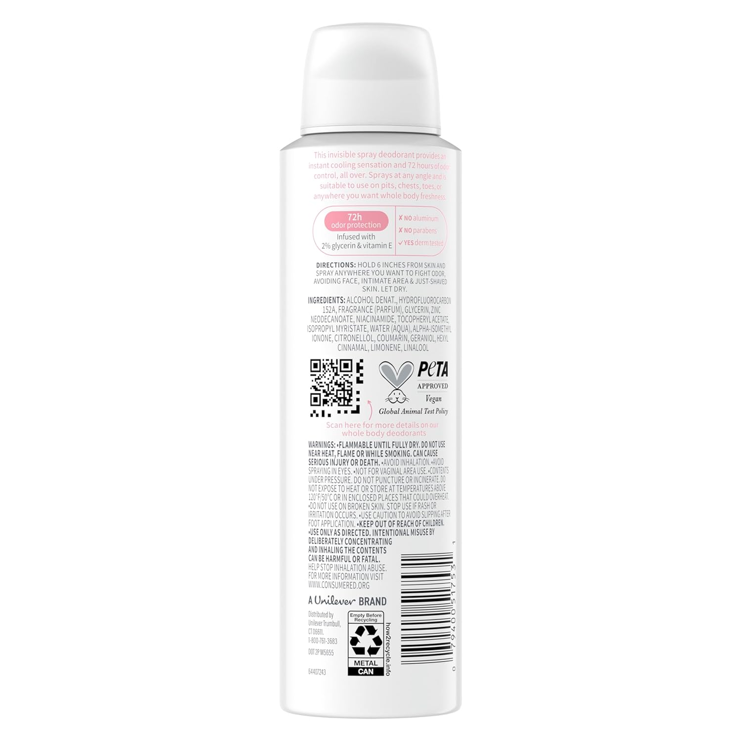- CARE YOU CAN COUNT ON: Globally, Dove does not test on animals, and this whole body deodorant spray is PETA-Approved Vegan and free from aluminum and parabens