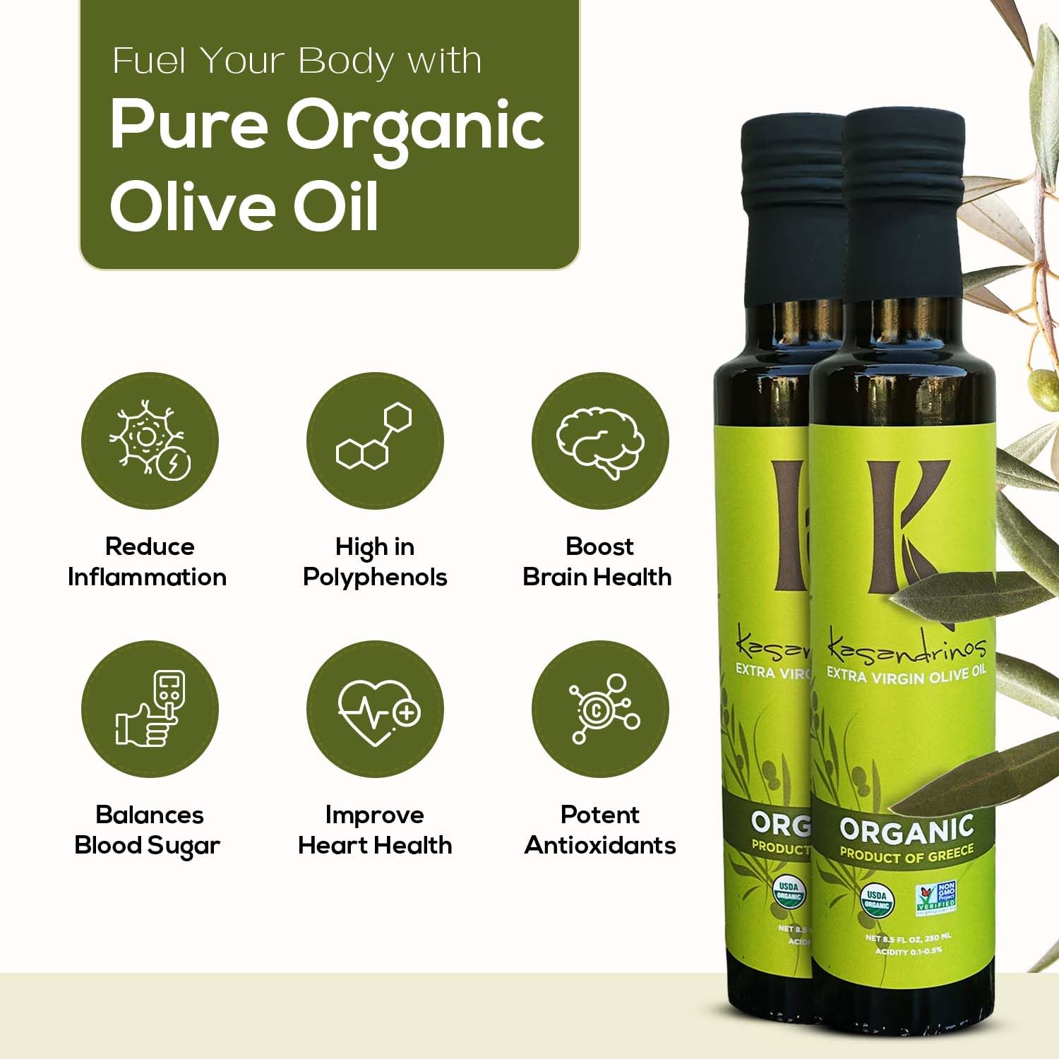 Kasandrinos Organic Olive Oil Extra Virgin, Polyphenol Rich Greek Olive Oil, 100% Organic First Cold Pressed, Mild + Delicate Flavor, Verified by Non GMO, 250 ml / 8.5 oz (Pack of 2)
