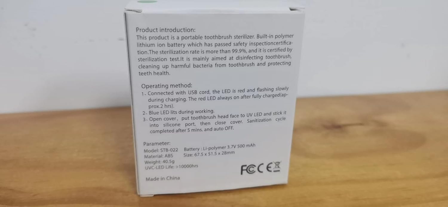- Toothbrush Cleaner: The toothbrush holder uses 270 nm light to remove bacteria from your toothbrush in just 5 minutes. EPA Est. No. 99068-CHN-1.