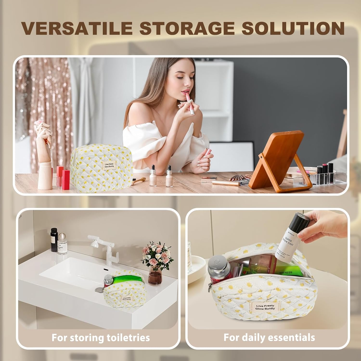 3Pcs Large Travel Quilted Makeup Bag, Double Layer Cute Floral Cotton Toiletry Bag, Aesthetic Flower Cosmetic Bag Coquette Skincare Organizer Bag for Women (78-Lemon)