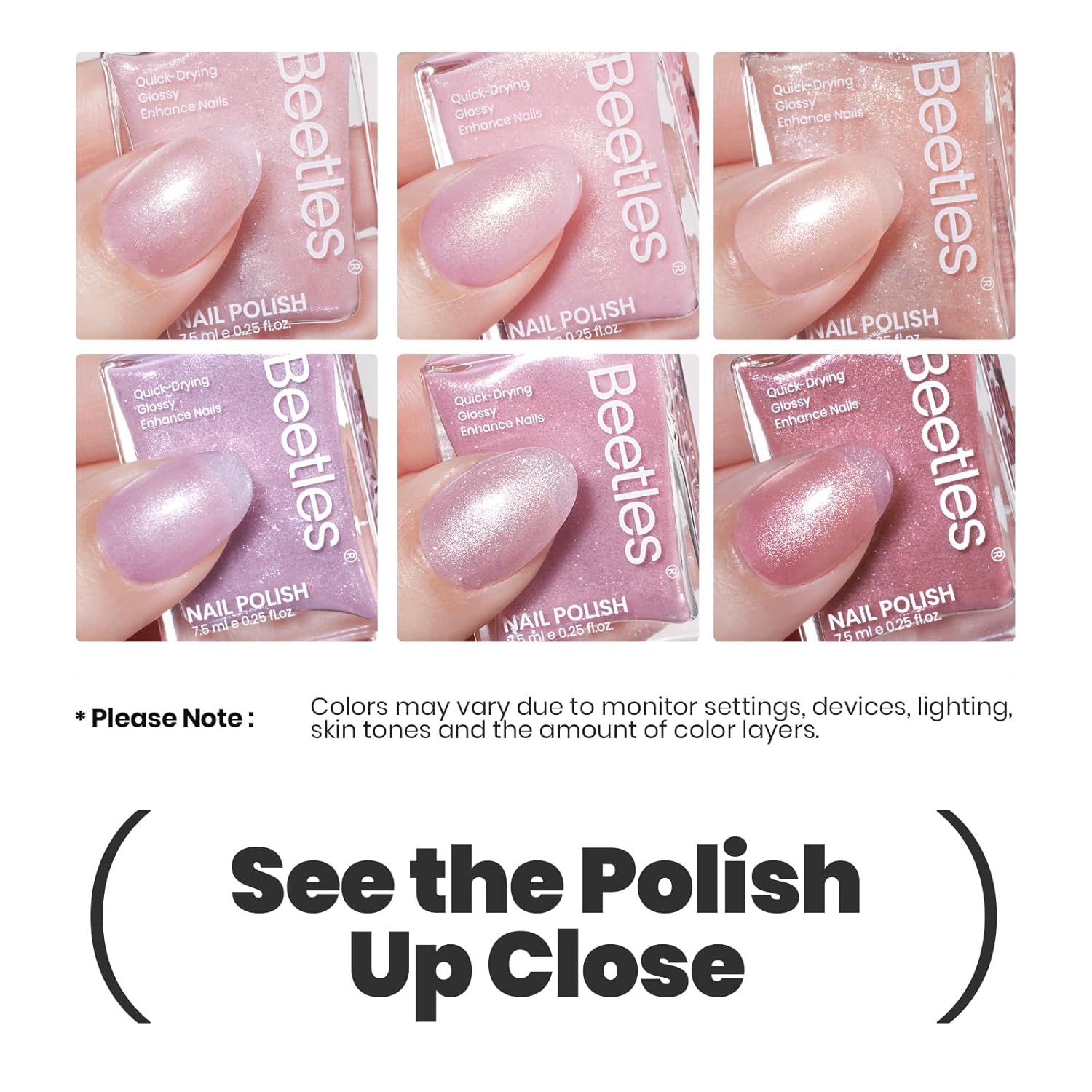 Beetles Pink Nail Polish Set, 6 Colors Glitter Quick Dry Nail Polish Kit Sly Moonlit Fairy Fingernail Polish Gifts for Women Salon DIY Manicure Kit