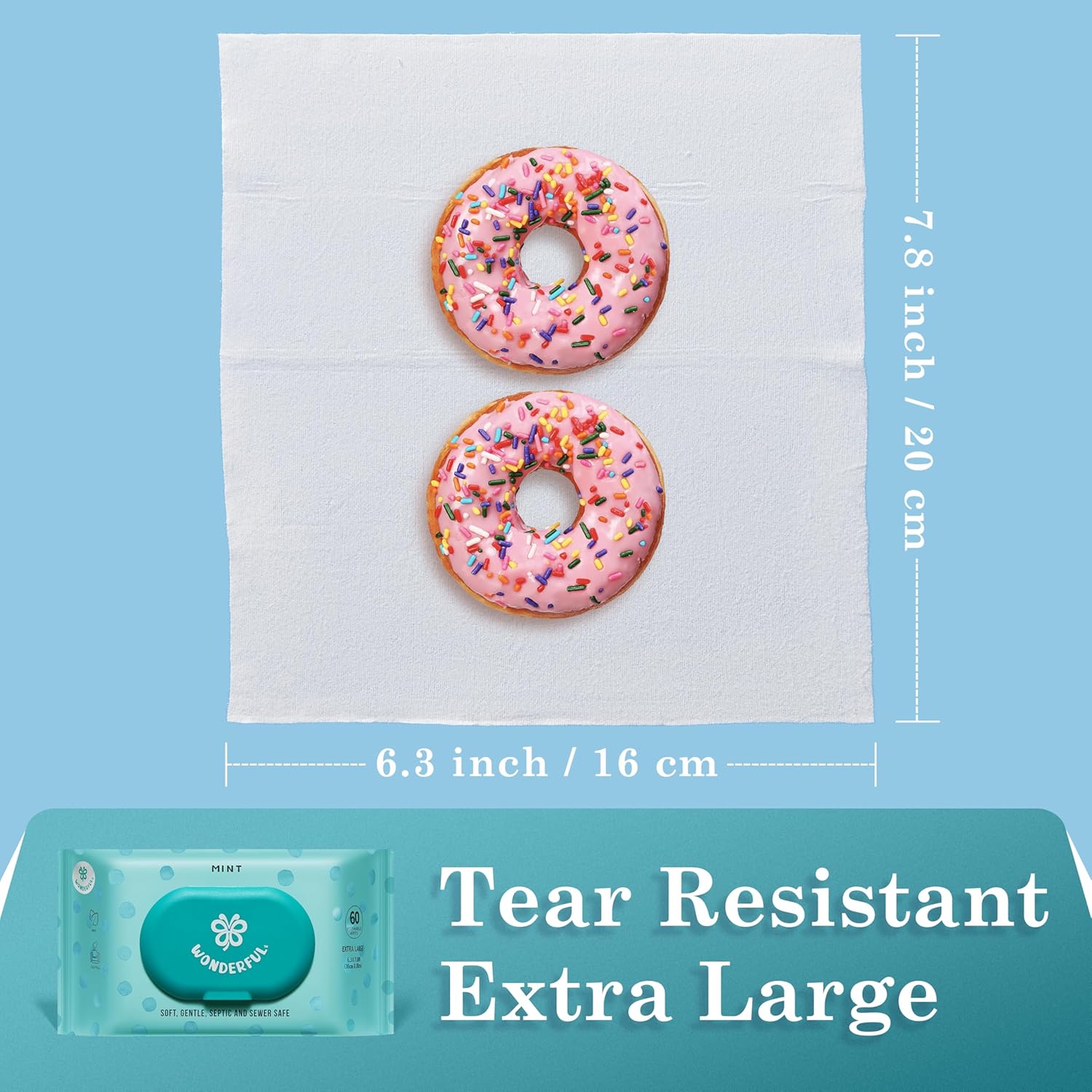 WONDERFUL Flushable Wipes, Mint 100% Plant-Based Wet Wipes for Adults & Kids, Sewer & Septic Safe, Gentle for Sensitive Skin, Wipes Flushable Pack for Bathroom & Travel, 3-Pack (180 Counts)