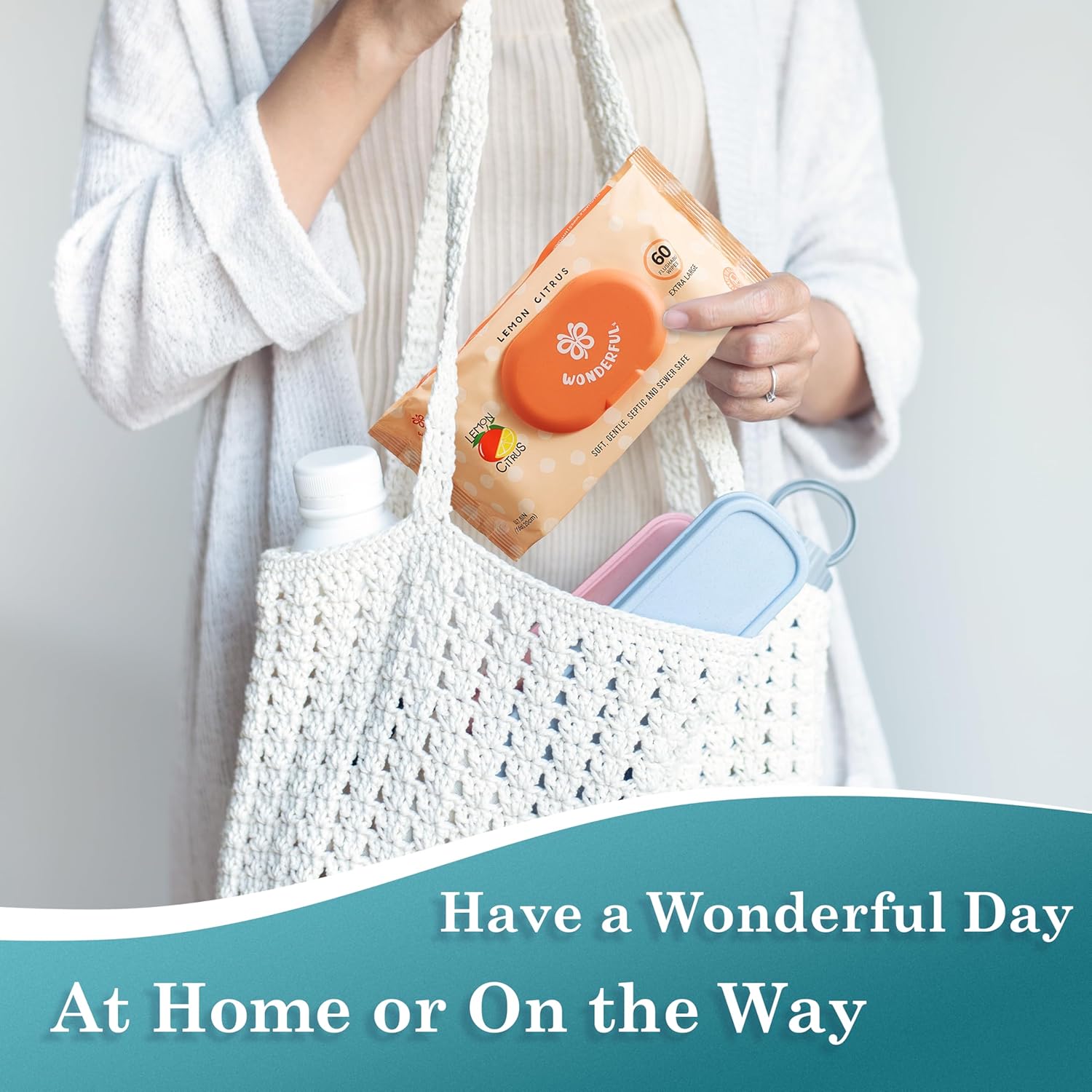 WONDERFUL Flushable Wipes, Lemon Citrus 100% Plant-Based Wet Butt Wipe for Adults & Kids, Sewer Septic Safe, Gentle for Sensitive Skin, Wipes Flushable Pack for Bathroom & Travel, 6-Pack (360 Counts)