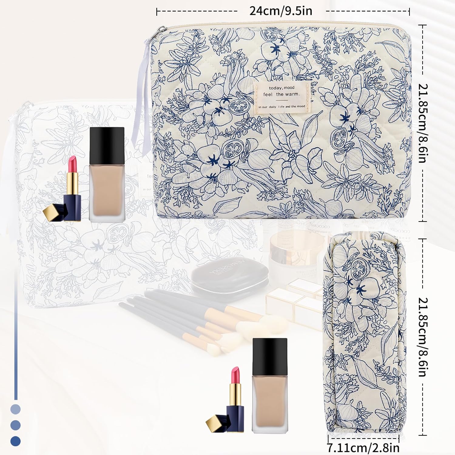Floral Makeup Bag, Small Cosmetic Bag for Women Girls, Cute Cotton Makeup Bag, Quilted Makeup Bags, Flower Travel Toiletry Organizer Bag(Navy Blue)