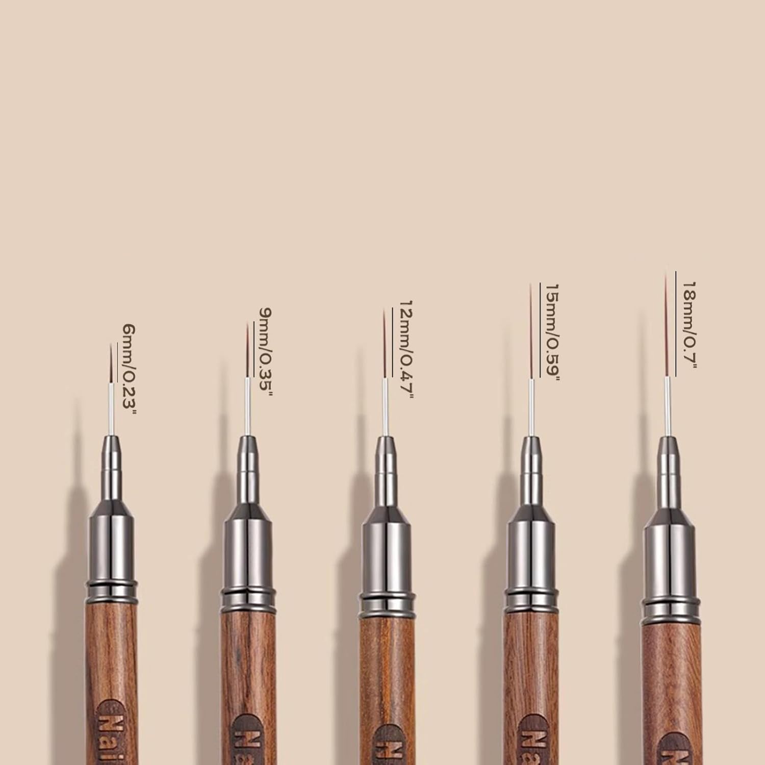 - Versatile Brush Sizes: This 5-piece set includes liner brushes with bristles in 6mm, 9mm, 12mm, 15mm, and 18mm sizes, offering a range of options for different line thicknesses and intricate details in your nail art designs.