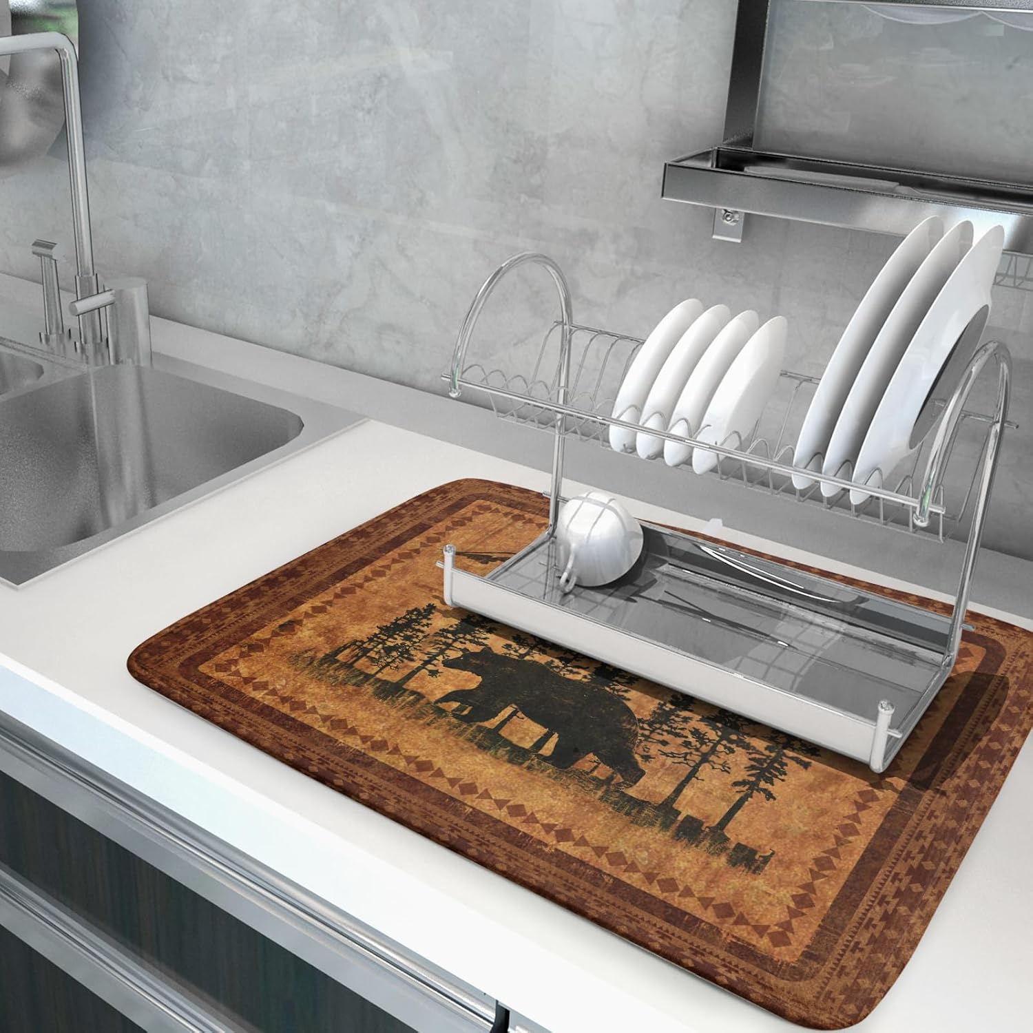 - 【Wide Usage】The dish drying mat designed with vintage bear pattern, it is beautiful, soft, and durable. Not only a dish drying mat, cup mat, heat resistant mat, you can also use it as a kitchen countertop insulation mat. It is also a good choice to use it as a pet mat, picnic mat.