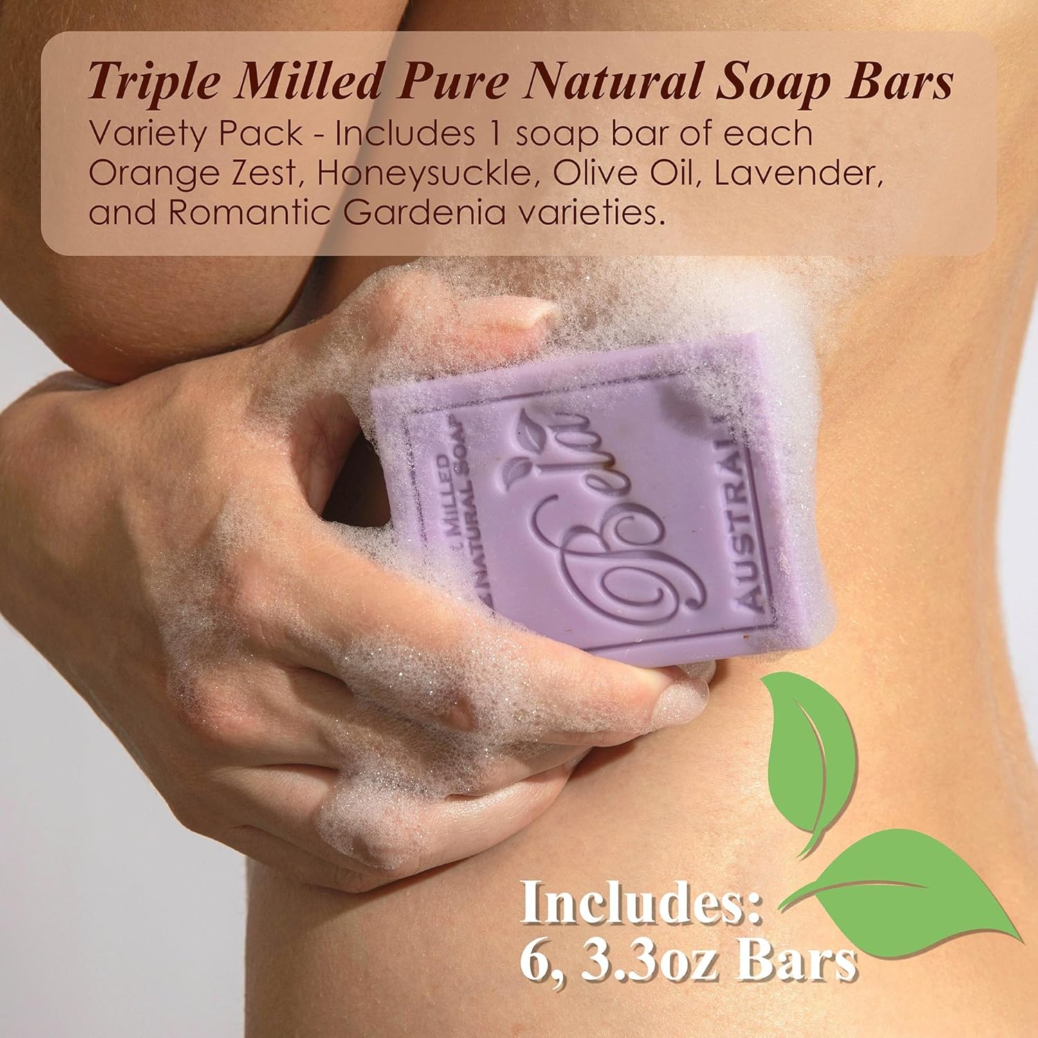- Luxurious French Milled Bar Soap Variety Pack: What are you in the mood for? This Bela soap variety pack features 1 each of Orange Zest, Honeysuckle, Olive Oil, Lavender, Ocean and Romantic Gardenia. Our luxury soap is rich, long lasting and infused with organic shea butter.