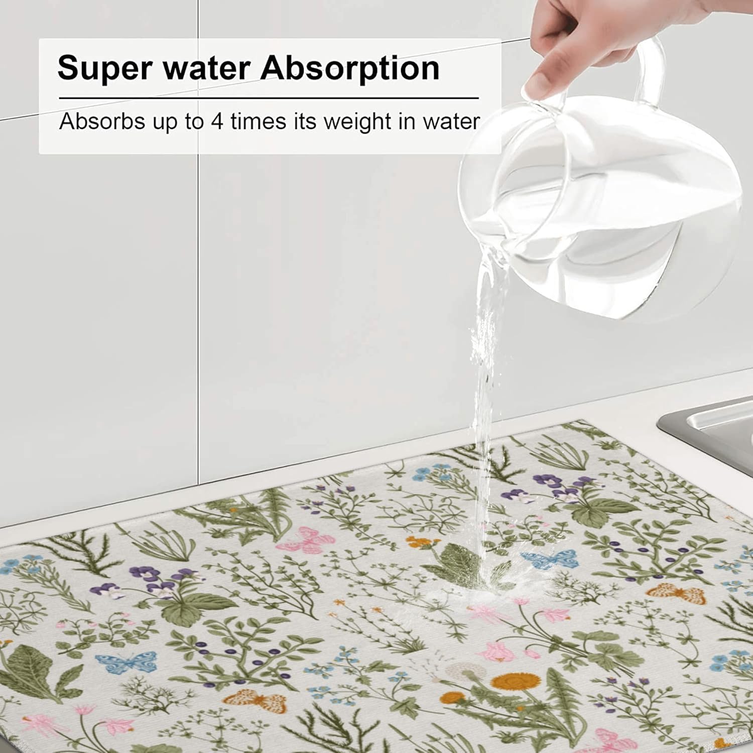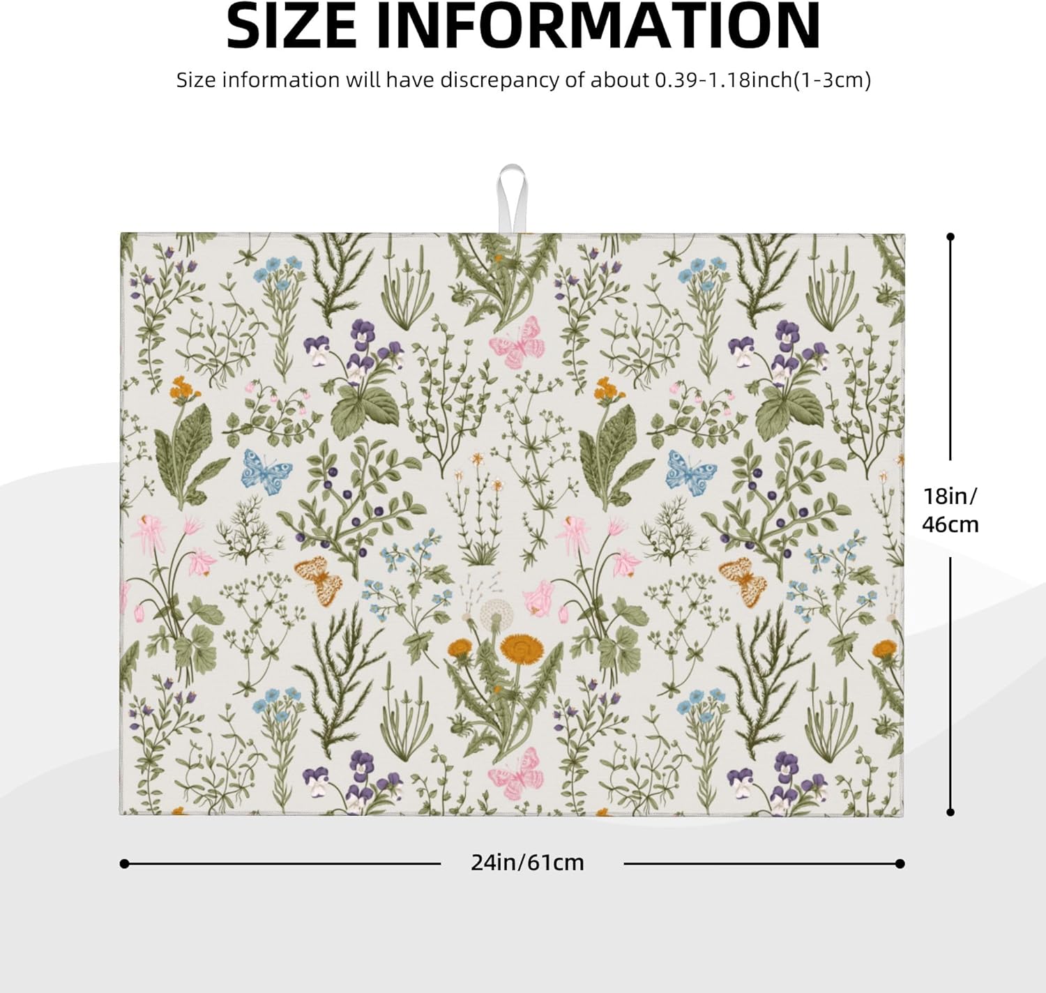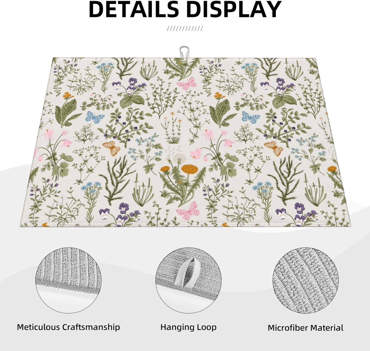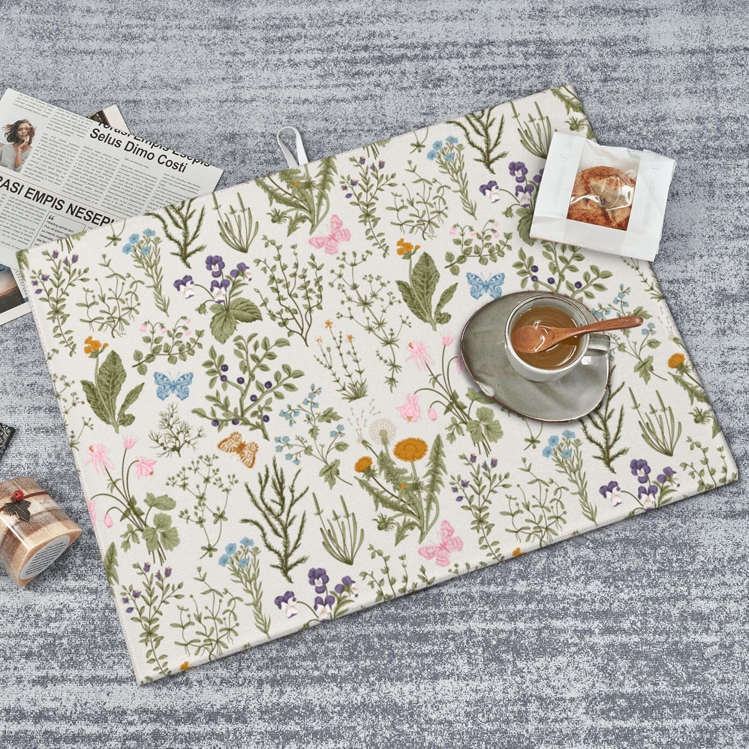 Vintage Floral Spring Summer Dish Drying Mat for Kitchen Counter, Herbs and Wild Flowers Drying Pad 18x24 Inch Absorbent Reversible Cute Botanic Dish Drainer Rack Mats