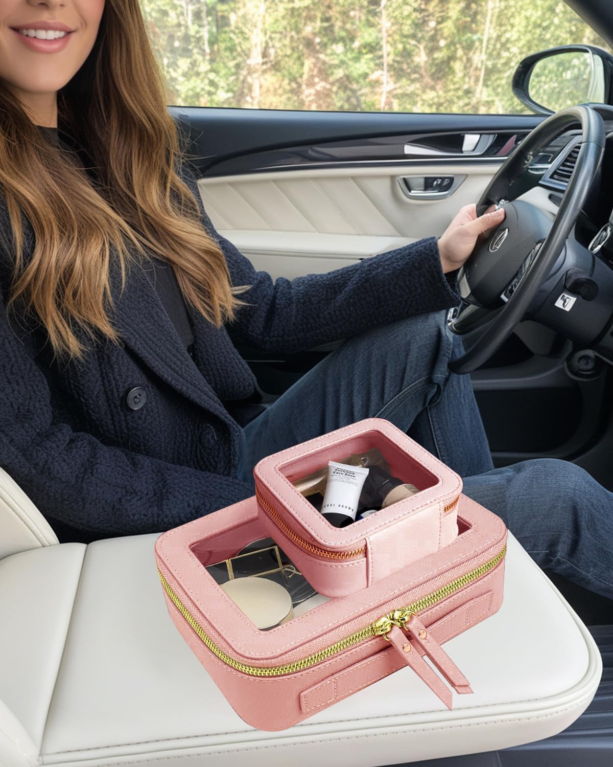 - Car Must Have Essential: Our large and small travel toiletry bag is roomy to store your makeup brushes, lipstick, eyebrow pencil, make-up foundation,skin care, cables, chargersor and other little items.It make your daily make-up, cream, lipstick, perfume and other beauty things organized and protected.This clear mini toiletry bag can be a good car accessory fits in the center console or other parts of your car.
