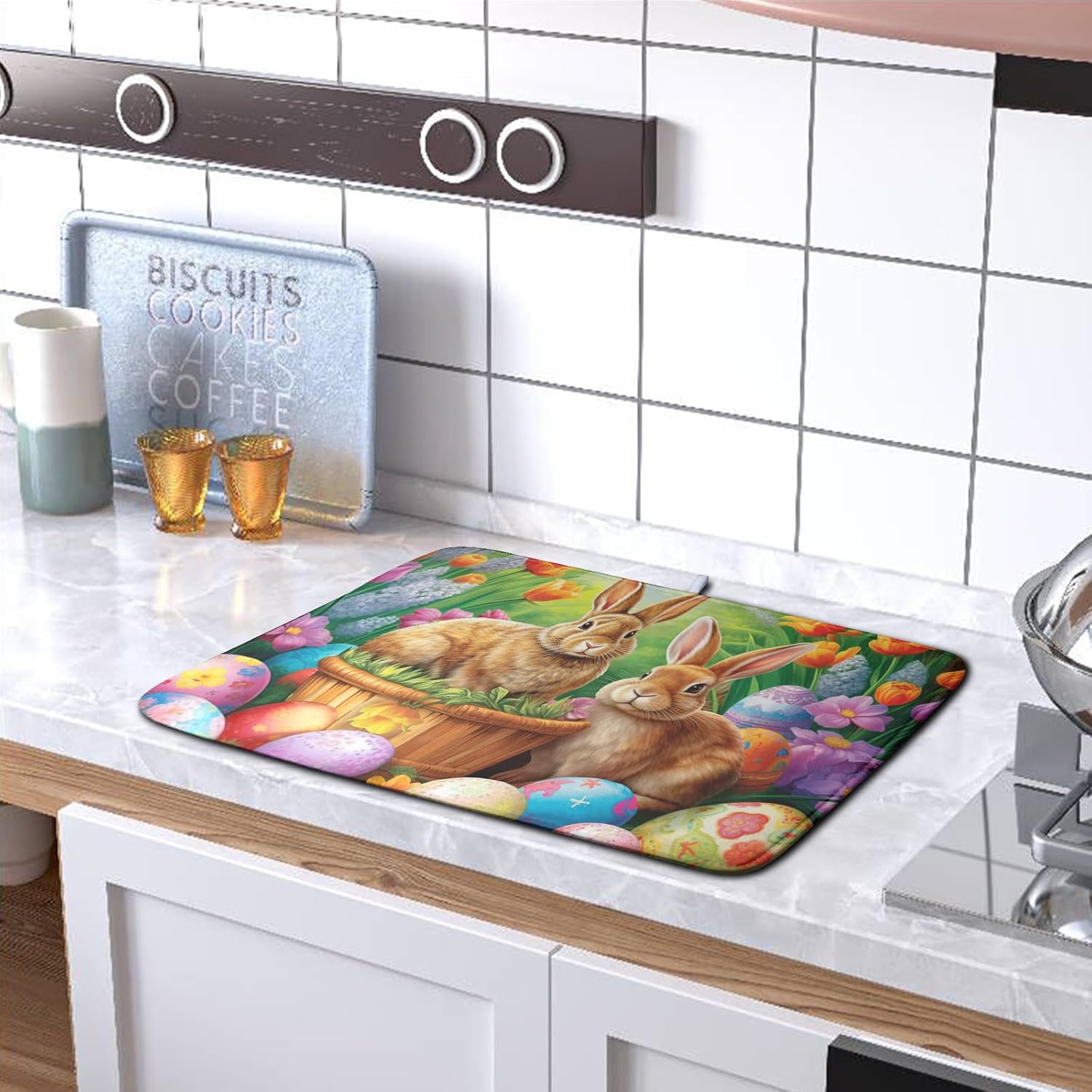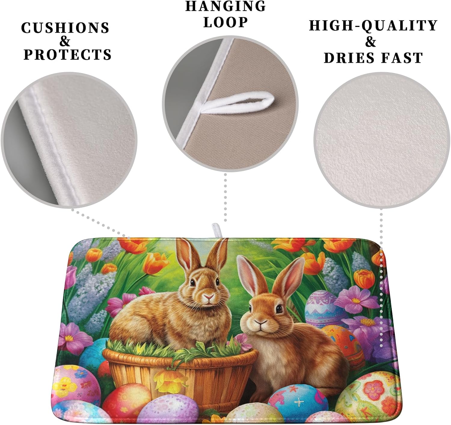 Easter Bunny Eggs Dish Drying Mat for Kitchen Counter, Tulip Floral Flower Drying Mat Spring Summer Holiday Dish Mat Drying Kitchen Mat Absorbent Kitchen Drying Mat for Sink 16x18Inch