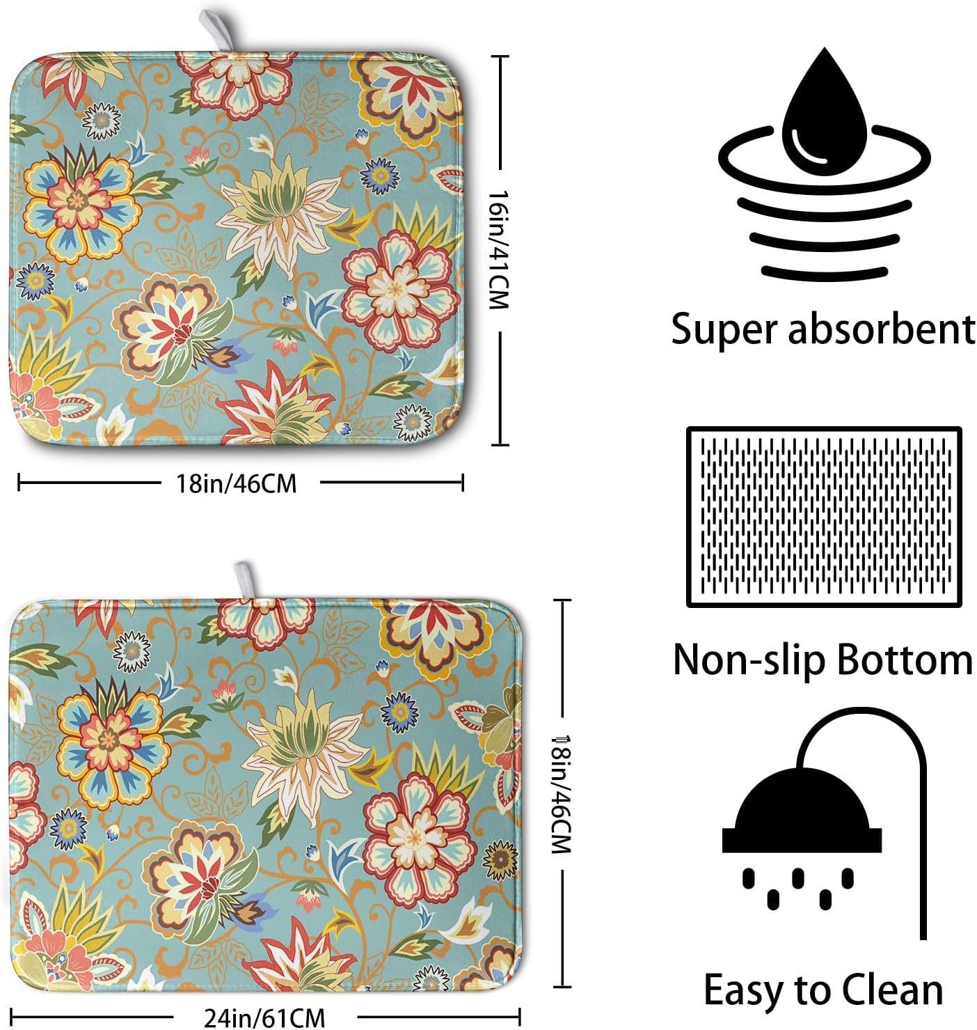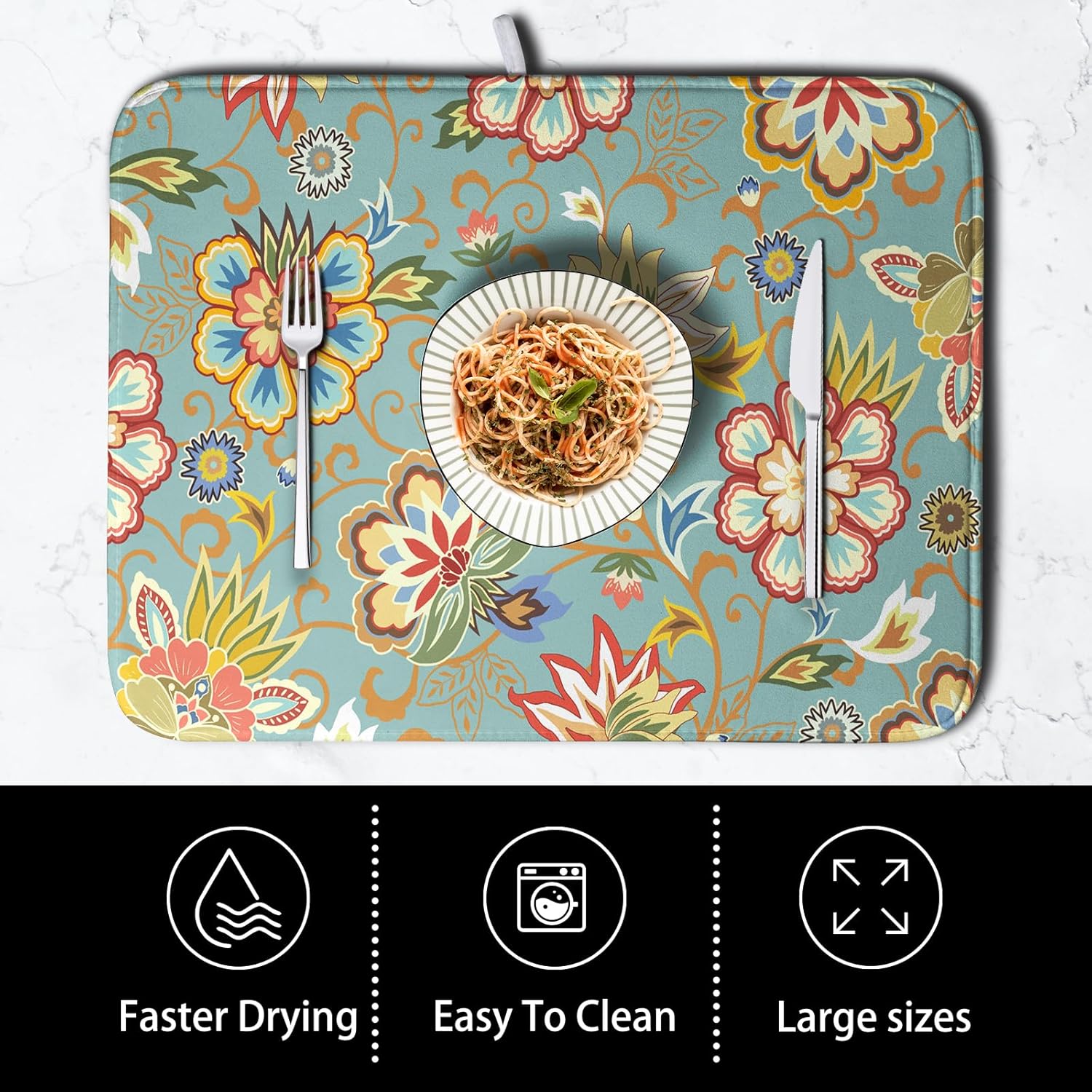 Boho Floral Kitchen Dish Drying Mat for Dishes 16x18 Inch Vintage Mandala Colorful Flowers Drying Mat Green Bohemian Dish Drainer Mat Super Absorbent Dish Rack Pad for Coffee Bar Sinks
