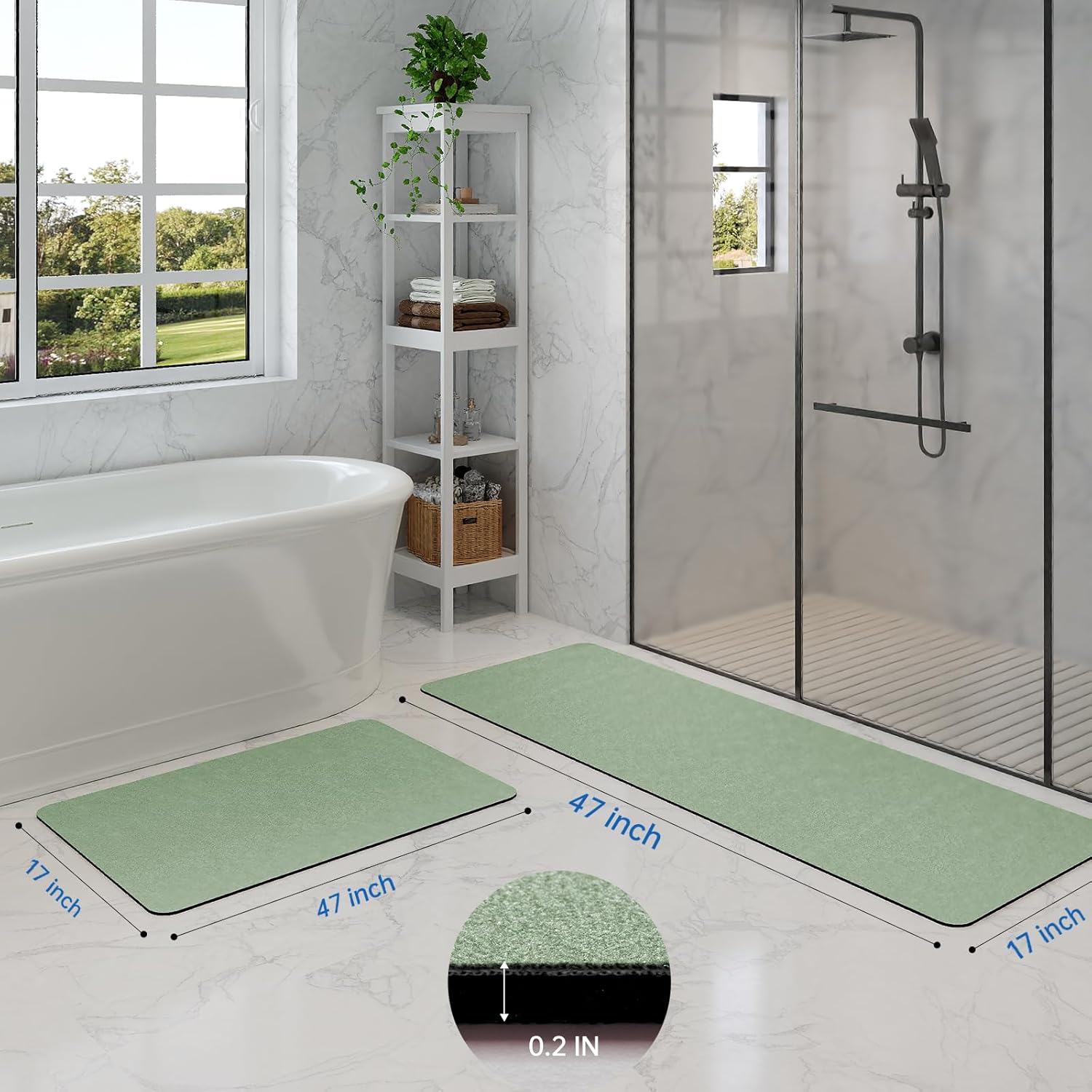 Sage Green Bath Mat Set 2 Piece - Quick Dry Super Absorbent Diatomaceous Earth Bathroom Rugs With Rubber Backing Non-Slip for Shower Floor, 47x17 + 24x17