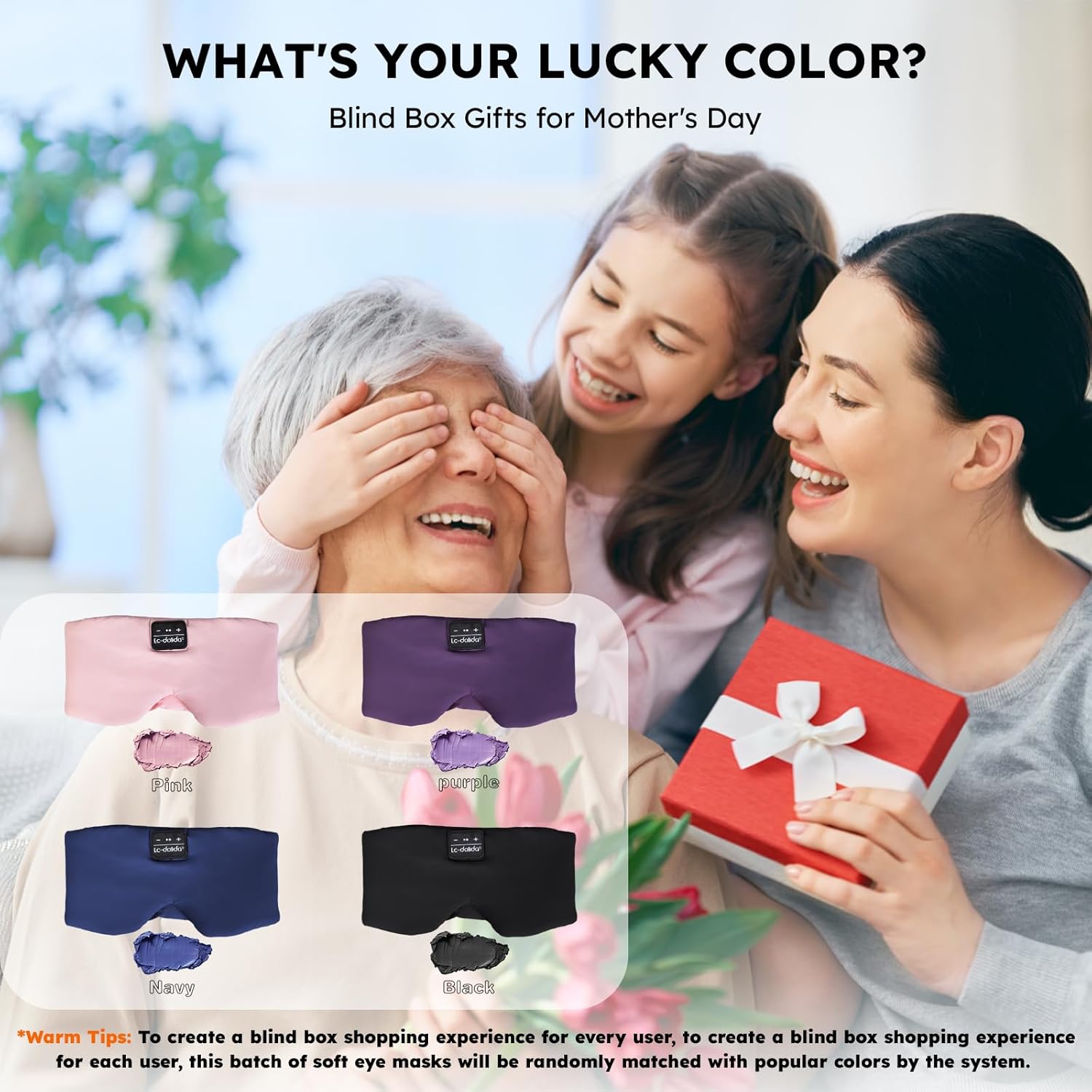 - 💝𝐔𝐧𝐥𝐨𝐜𝐤 𝐌𝐲𝐬𝐭𝐞𝐫𝐲 𝐂𝐨𝐥𝐨𝐫𝐬: 𝐖𝐚𝐫𝐦 𝐓𝐢𝐩𝐬: To create a blind box shopping experience for every user, To create a blind box shopping experience for each user, this batch of soft eye masks will be randomly matched with popular colors by the system. What is your lucky color? Give a surprise gift to your loved ones. If you are not satisfied with the color or use of the sleeping eye mask you received, you can send us an email at any time and we will provide you with a satisfactory solution within 12 hours