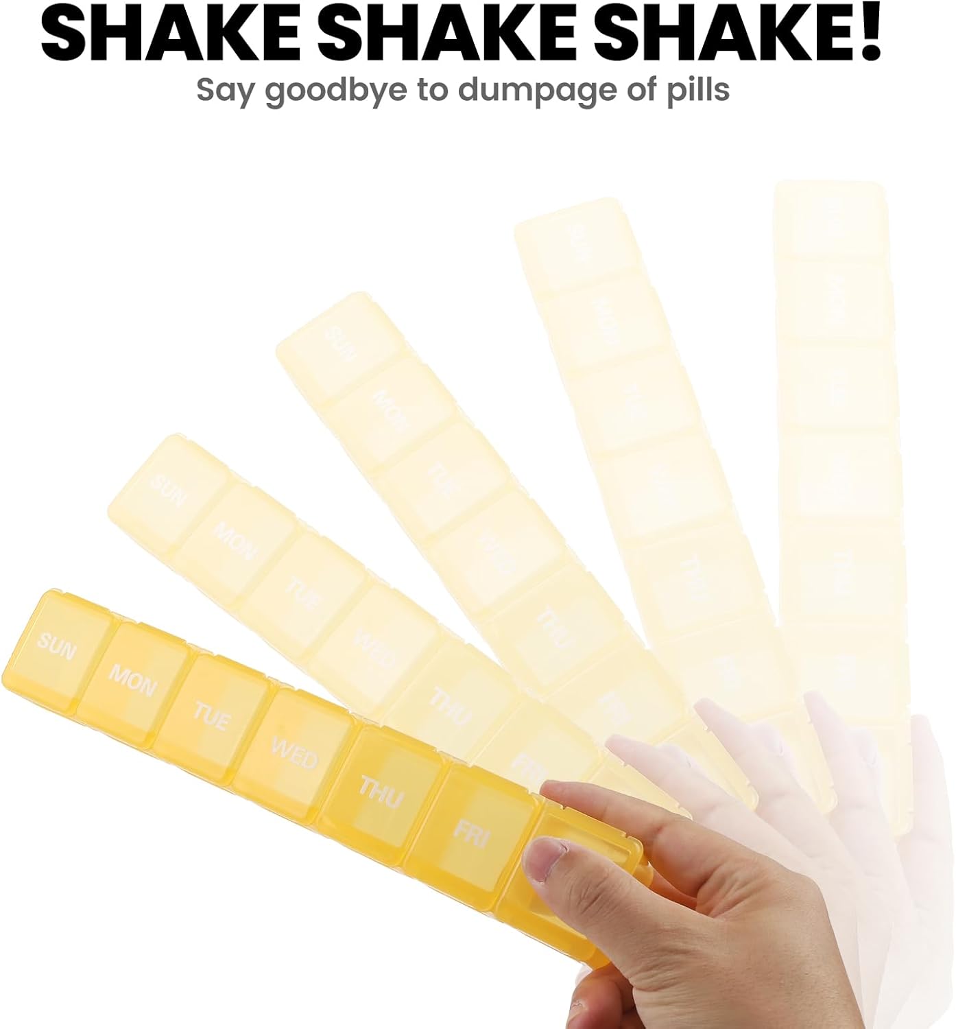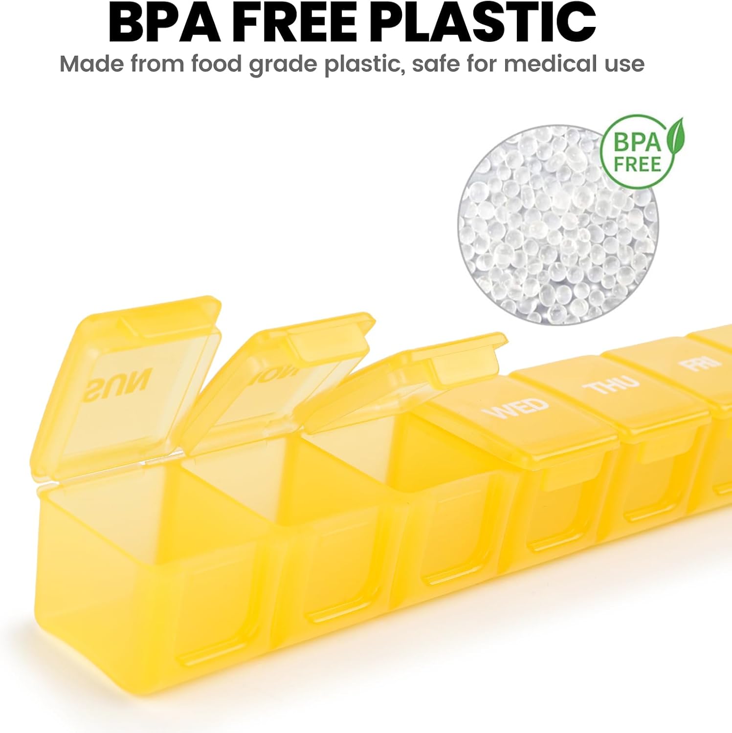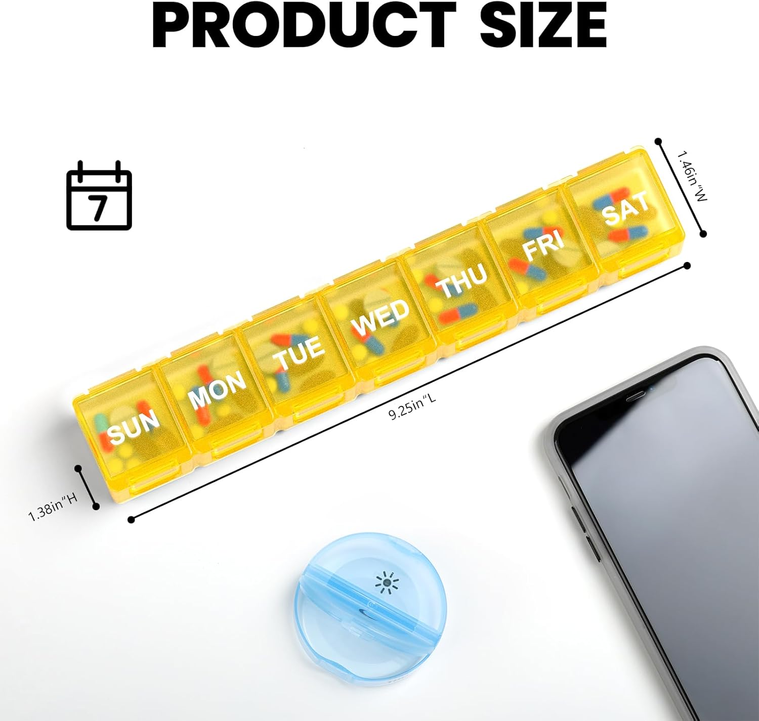 - No Need To Remember & Durable: This 7-day pill box features bold marks for the week, making it simple to track your pills without needing to remember. The upgraded printing ensures that these marks remain durable, lasting up to 10,000 uses without showing any wear and tear.