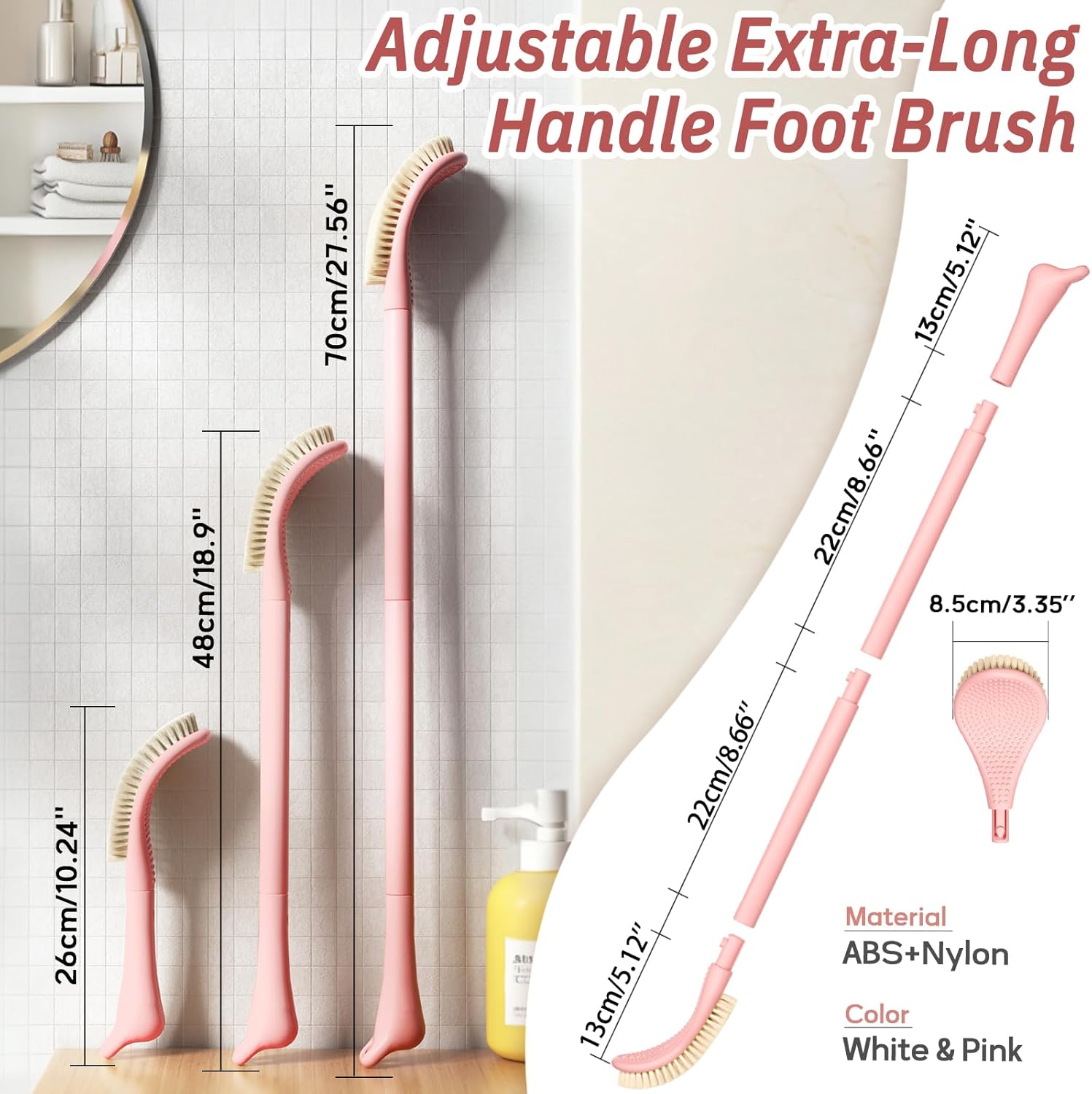 New Foot Brush with Extra-Long Handle, 3-in-1 Foot Scrubber for Wet or Dry Brushing, Adjustable 10.2’’- 27.5’’Foot Scrub Brush for Senior, Pregnant, Disabled, or Injured, Gift-Box Packed(Pink)