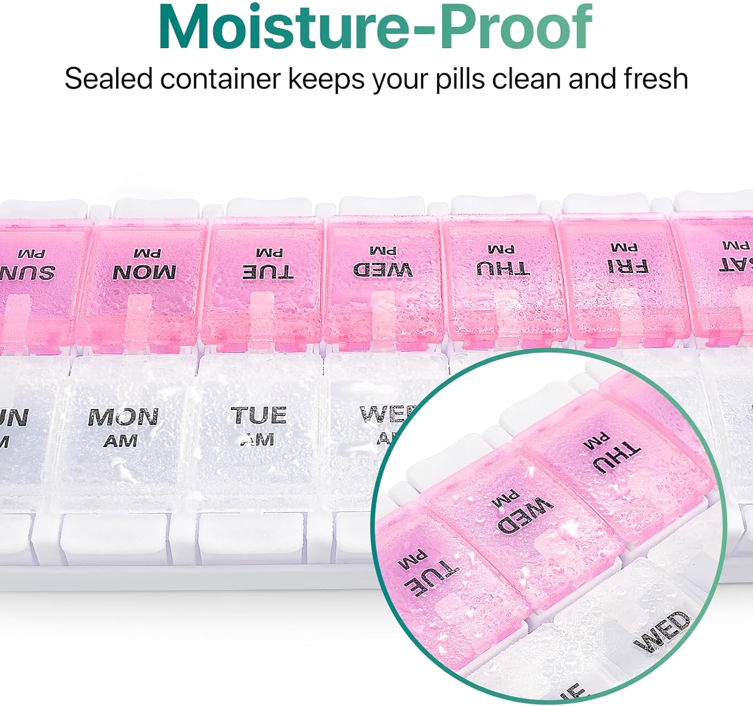 - HEALTH FRIENDLY: Made from food grade quality material, this odorless pill sorter 2 times a day is safe for health care or medical use. The transparent case and AM/PM marks make it easy for users to distinguish their medicines.