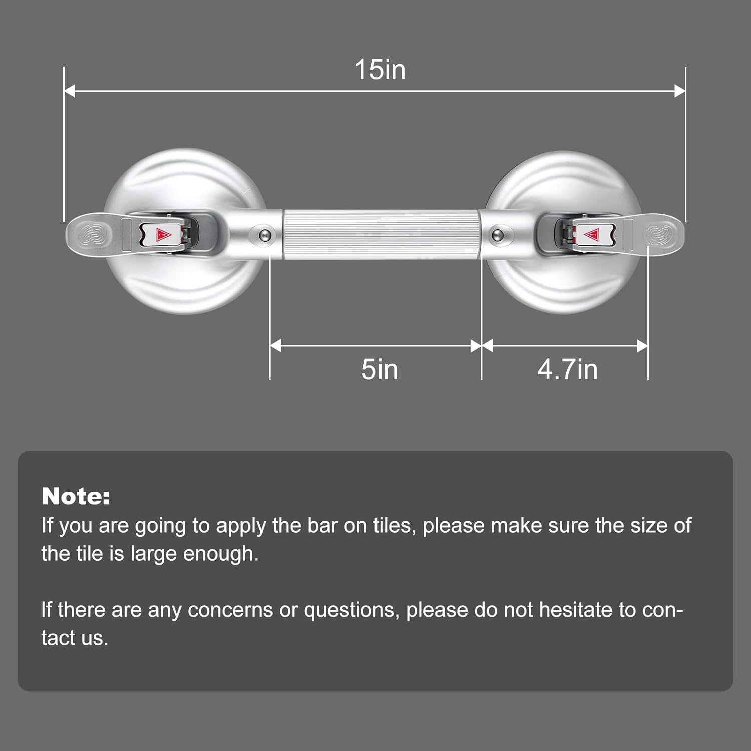15-Inch Shower Handle - Upgraded Grab Bar with Strong Suction Cups for Bathtub & Shower Safety, Ideal for Seniors, Elderly, Disabled -Silver