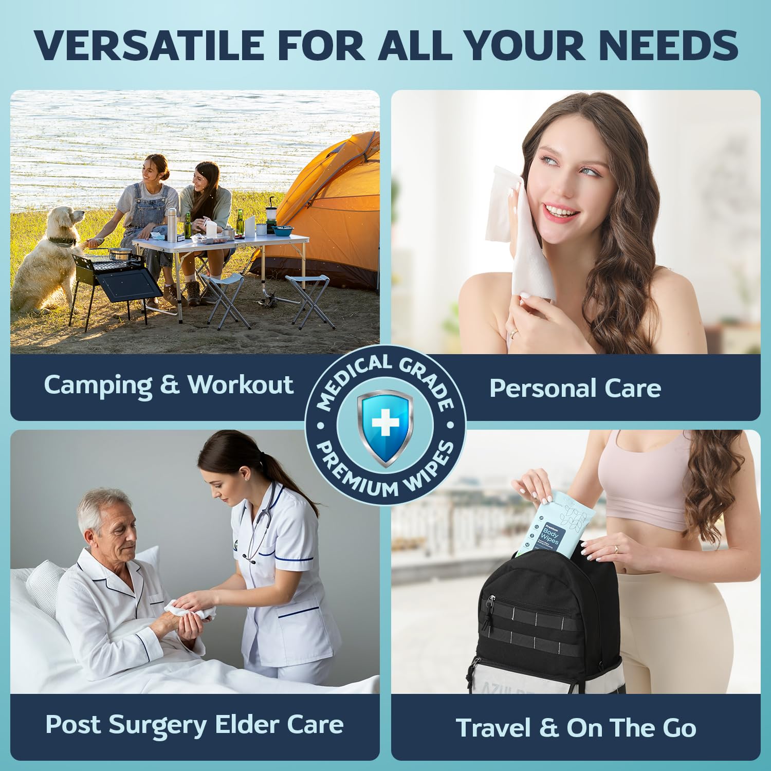 - Versatile & Durable – Engineered for durability, these wipes work double-duty as disposable washcloths and even function as bath cloths for body wash. Perfect for hospital stays, camping trips, or daily emergencies, they provide a reliable clean-up solution when a full shower isn’t an option.