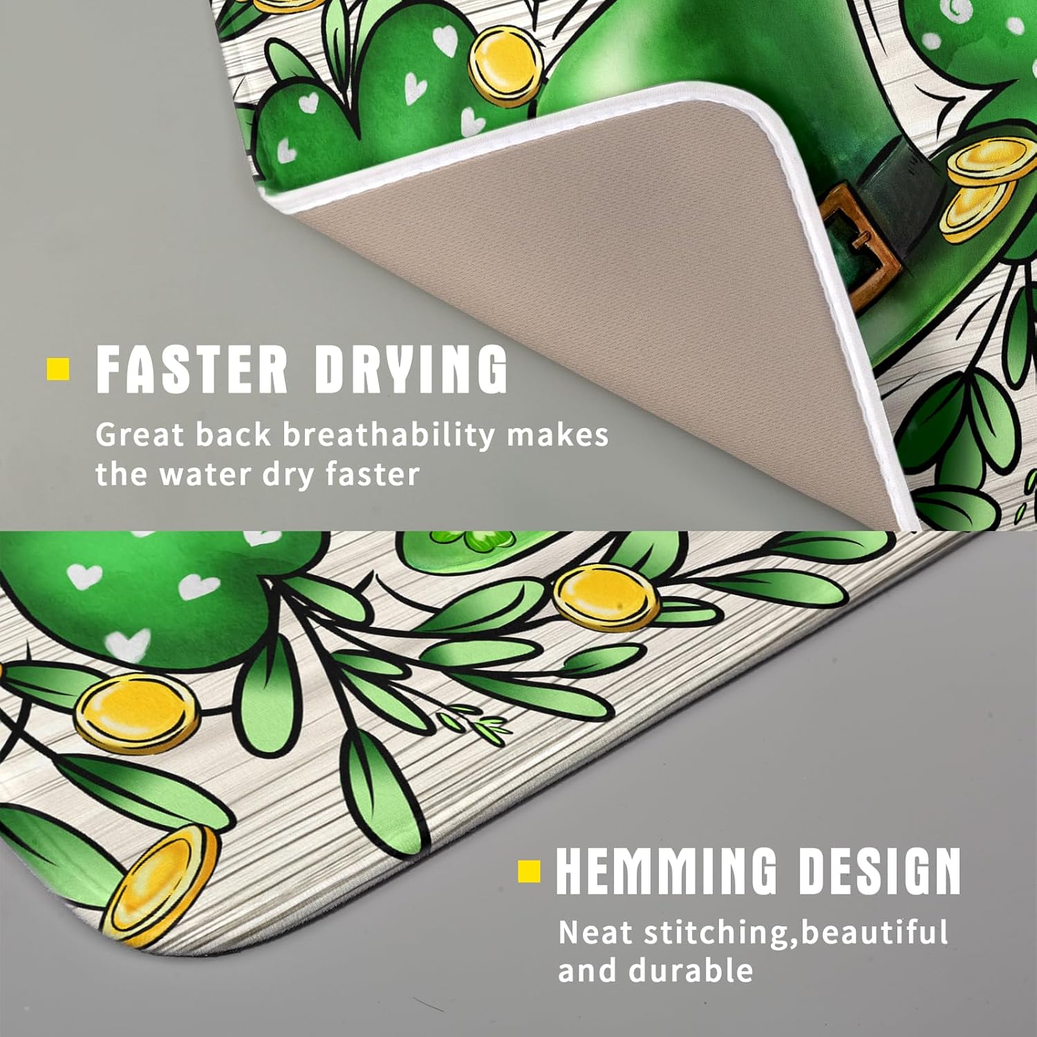 - 【Easy to Storage】This green clover design drying mat with hang rope, soft and foldable, durable, easy to storage it by hanging or folding it up in a drawer or tuck it elsewhere. Perfect for tight spaces like campers, boats and cottages where having a dual purpose item will come in handy.