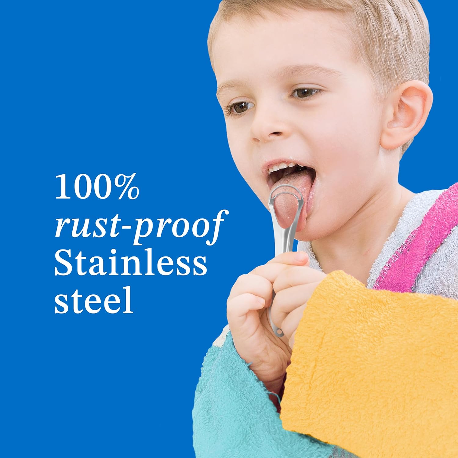 - RUST-PROOF, 100% STAINLESS STEEL: This stainless steel tongue scraper kids is made with high-quality, 100% Stainless Steel to ensure durability and performance. This kids tongue scraper is specially designed to clean the hard to reach places in your tongue, keeping your mouth feeling fresh and clean. This tongue cleaner won't be beat!