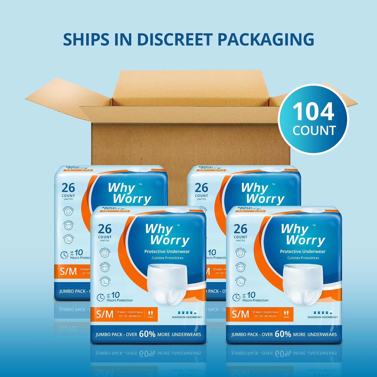 WhyWorry Incontinence Underwear for Women and Men, Disposable Adult Pull Ups with Overnight Absorbency, Leakproof, Unisex, Small/Medium, 104 Count (4 Packs of 26)