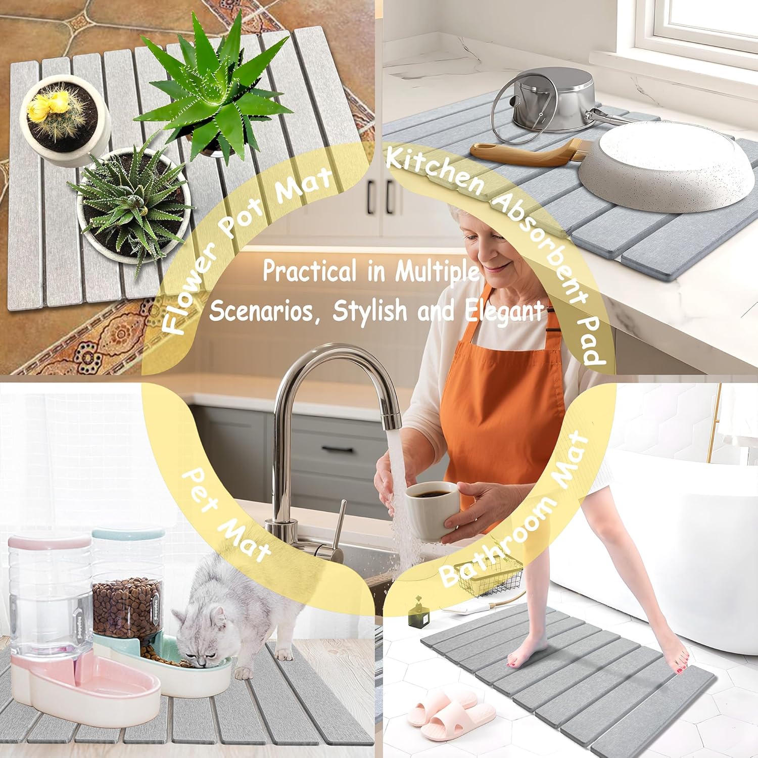- Stain-Resistant & Easy-Clean: The light gray stone drying mat surface cleverly masks everyday stains. For maintenance: Avoid dark liquids like coffee/wine. Simply wipe spills with a damp cloth, or spot-clean using vinegar + baking soda — no scrubbing needed to restore its fresh look