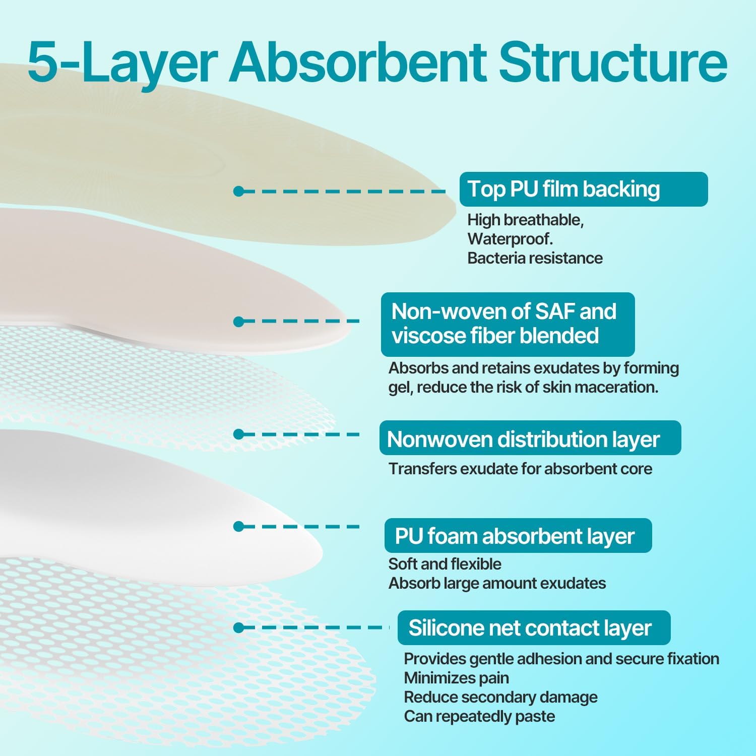 - TAKE GOOD CARE OF THE WOUND LESS PAIN - Absorbs 15 times of wound fluid thanks to our 5 layers material self-adherent dressings. It maintains a healthy moisture environment, creates a barrier from the outside, take good care of the wound.