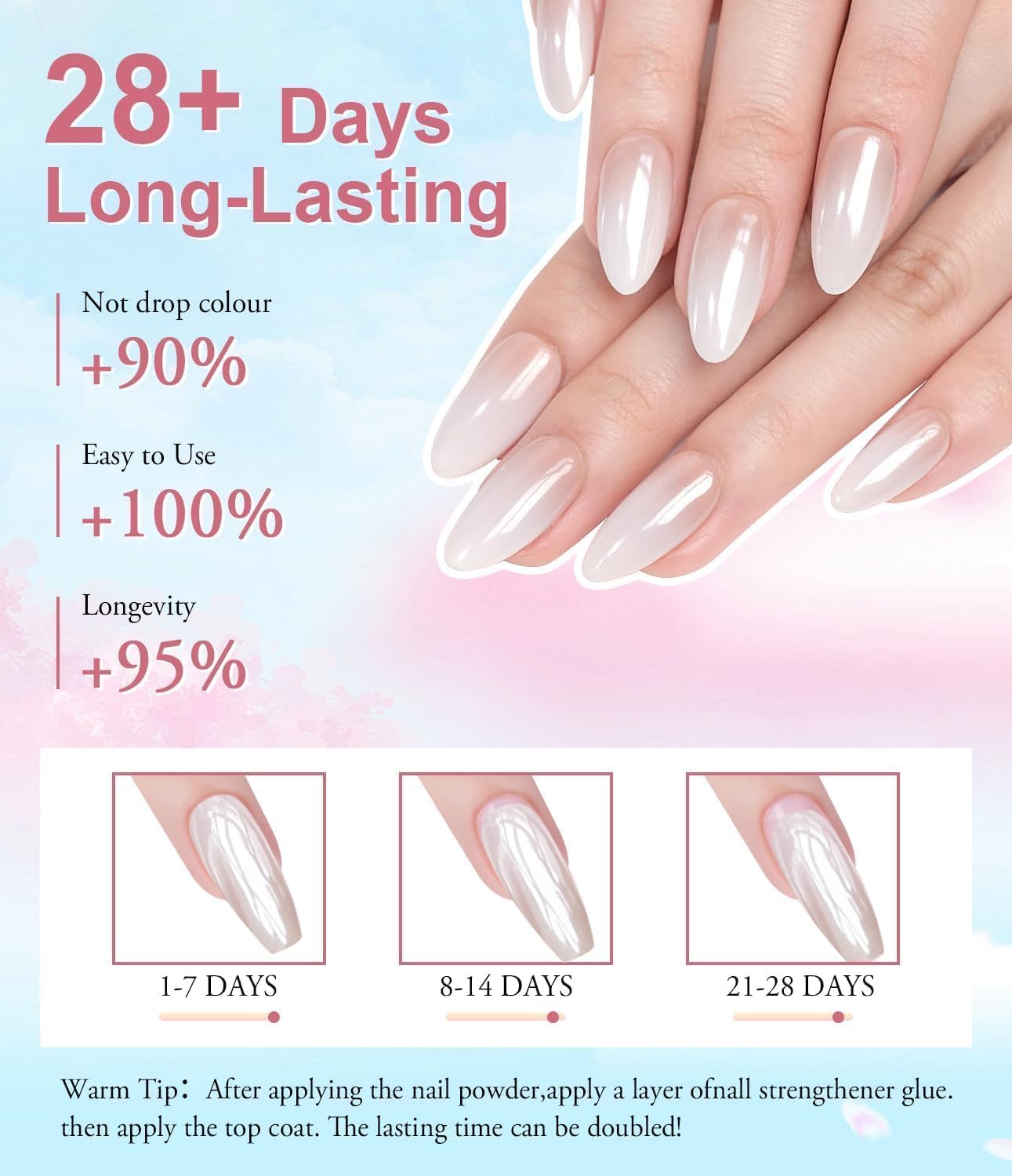 - Metallic Mirror Finish: Our chrome nail powder has sparkle and super mirror effect, like mirror-like metallic texture! It makes your nails look glittery, show elegant and stunning, like a "fairy" thanks to its astonishing chrome effect. And this glittery effect lasts for more than 28+ days.