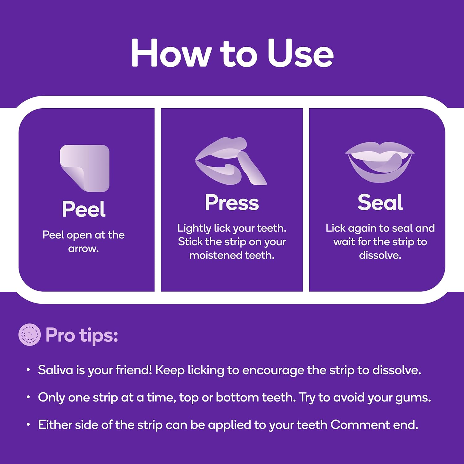 - 𝗠𝗘𝗦𝗦-𝗙𝗥𝗘𝗘 / 𝗤𝗨𝗜𝗖𝗞 & 𝗘𝗔𝗦𝗬 𝗧𝗢 𝗨𝗦𝗘: Simply apply a strip to your teeth (top or bottom), and let it dissolve to reveal a brighter, more confident smile.