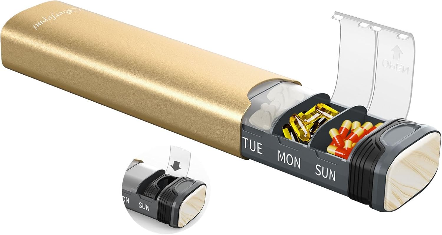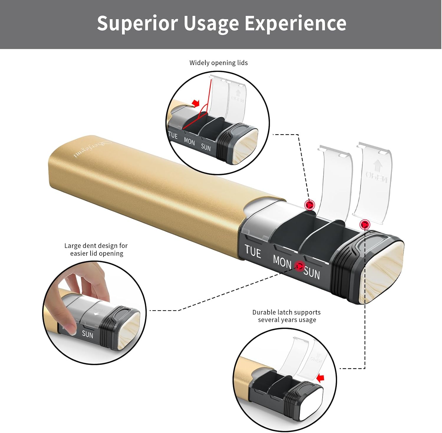 Metal Weekly Pill Organizer, Serfeymi Aluminum Daily Pill Box(Spare Gasket Provided),7 Day Pill Case Travel Medicine Organizer,Pill Containers with Individual Lid for Vitamins,Pills, Supplement-Gold