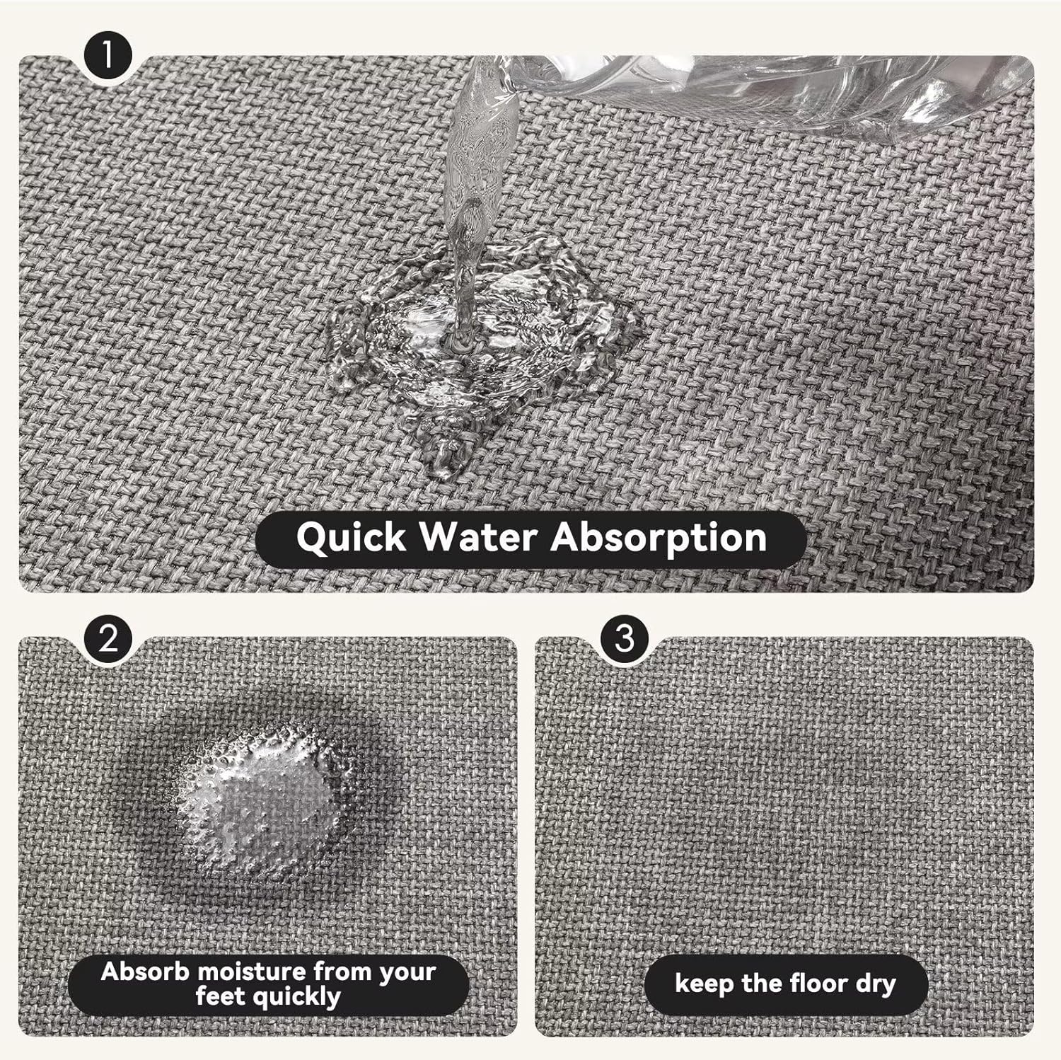 - SUPER ABSORBENT QUICK DRYING - This thin bath mat is woven with absorbent, quick-drying faux linen fabric, so when you get out of the bathtub or shower, the absorbent bath mat will quickly soak up the dripping water, protecting your feet and floors from getting wet. Our fabric process also allows the rug to dry quickly in an open-air environment, giving you a dry and comfortable bathroom.