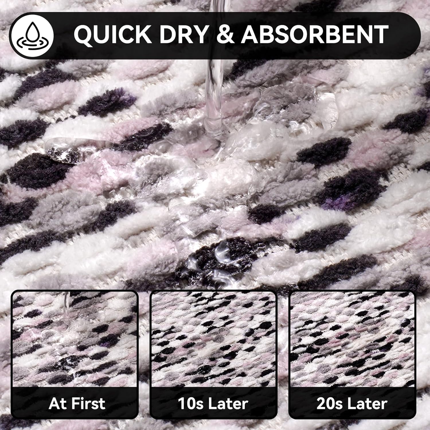 • Quick Dry & Super Absorbent:This chenille material can immediately dry your feet when you step on them, keep the water to stay on and in the mat and not spill over onto the floor,and prevent the floor from getting wet