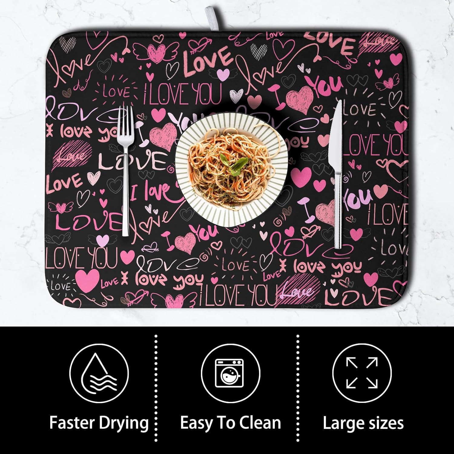 - Ultra Absorbency: The surface of the Valentine's Day dish drying mat is made of absorbent microfiber and the middle is made of composite sponge, absorbs 4X its weight in water, keep your counter dry. Absorbent, Colorful, Reversible, do not fade